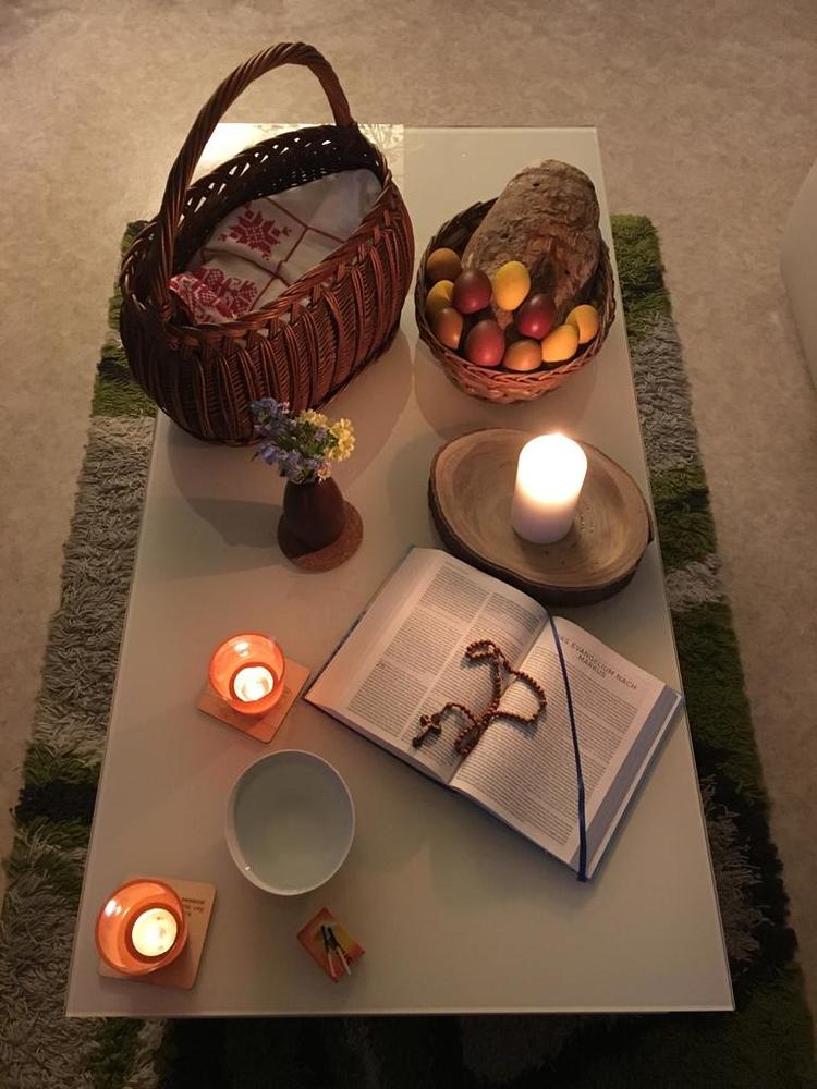 Die Mitfeiernden wurden im Vorfeld aufgefordert, sich eine schön gestaltete Mitte zu gestalten, eine Kerze und eine Schale mit Wasser bereitzustellen, ebenso auch die Speisen für die Fleischweihe.