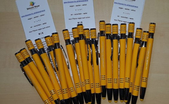 Seit kurzem gibt es sogar Dekanatskugelschreiber - ein ideales Geschenk für Interessierte in den Pfarren, Freunde, Familie, Bekannte,...! Mit diesen Kulis wollen wir auf die Dekanatshomepage aufmerksam machen und ein Stück weit "Öffentlichkeitsarbeit" betreiben.