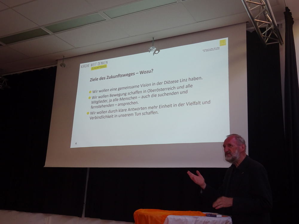 Bischofsvikar Willi Vieböck wies in seinem Eingangsstatement nochmals auf die Entstehung des Strukturprozesses hin, - dass es ursprünglich mit den 8 Themenfelder angefangen hat, wo die Option „zeitgemäße Strukturen“ eine davon ist und war. Ebenso wurde erklärt, warum es neue Strukturen für die Diözese braucht.