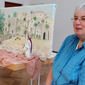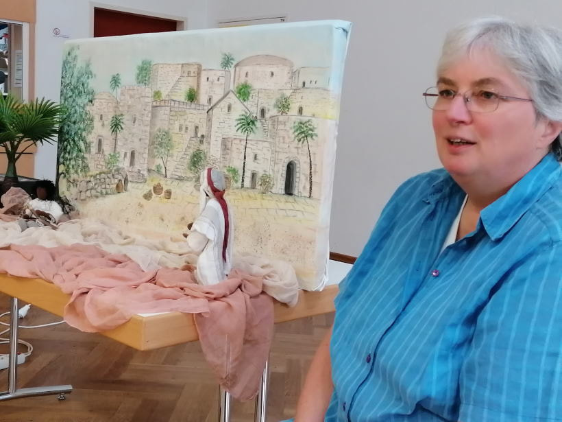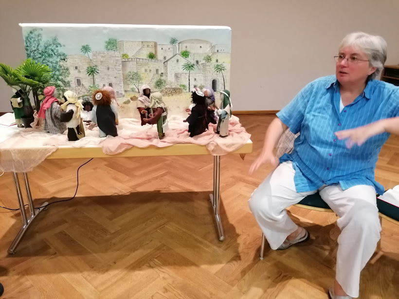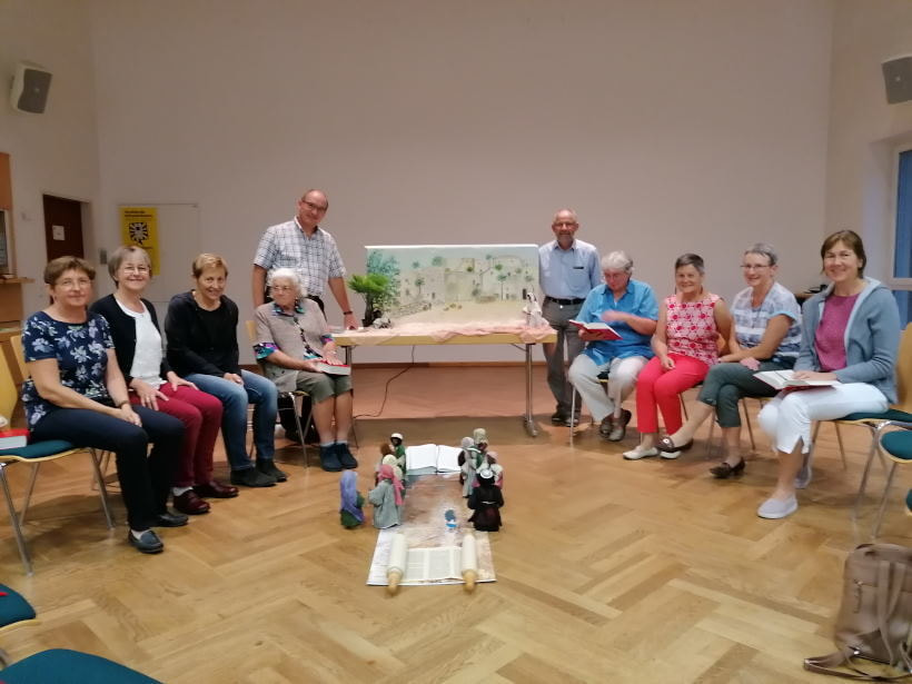 Der zweite Teil des Abends beinhaltete die Erarbeitung der Bibelstelle vom „Blinden Bartimäus“ aus dem Lukasevangelium. Martha erklärte zuerst anhand einer großen Landkarte die geografischen Gegebenheiten und auch die damals üblichen Umgangsformen mit kranken Menschen. Danach bat sie uns, mit einer Bibelfigur „am Geschehen“ mitzuwirken anhand folgender Impulse: Wie verhalten sich die BegleiterInnen von Jesus? Was könnte der Blinde gefühlt haben? Warum lässt er sich nicht unterkriegen? Warum hat Jesus gefragt: „Was willst du, das ich die tu?“
