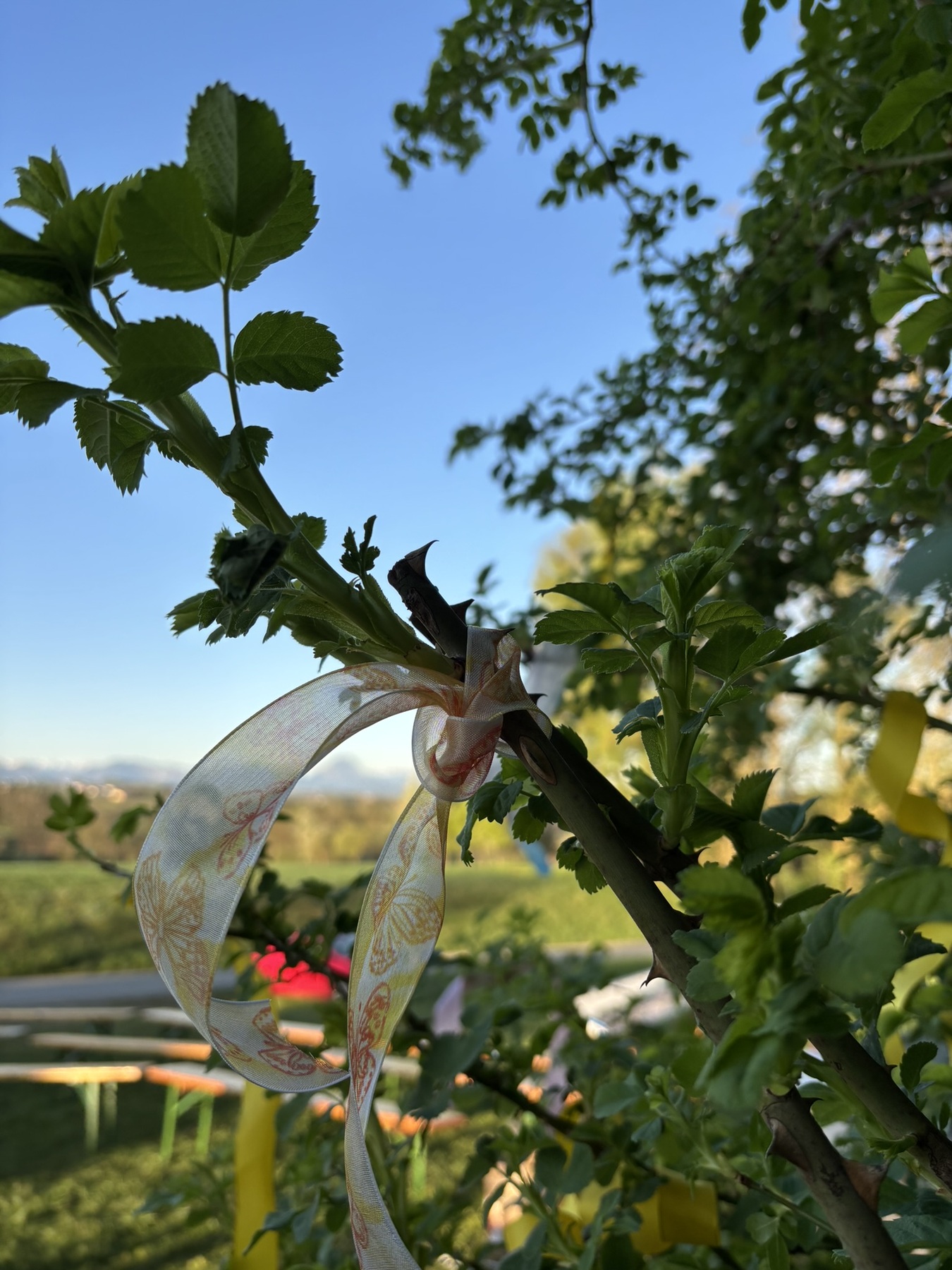 Ein weiteres besonderes Element war der Fürbittstrauch: Jede Fürbitte wurde als farbiges Band auf einen Strauch gebunden – sichtbar, greifbar, verbunden mit der Hoffnung, dass unsere Bitten wachsen und Früchte tragen.