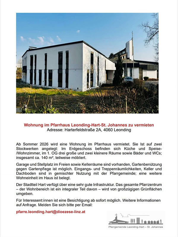 Leonding-Hart-St. Johannes: ab Sommer 2026 wird im Pfarrhaus eine Wohnung vermietet.