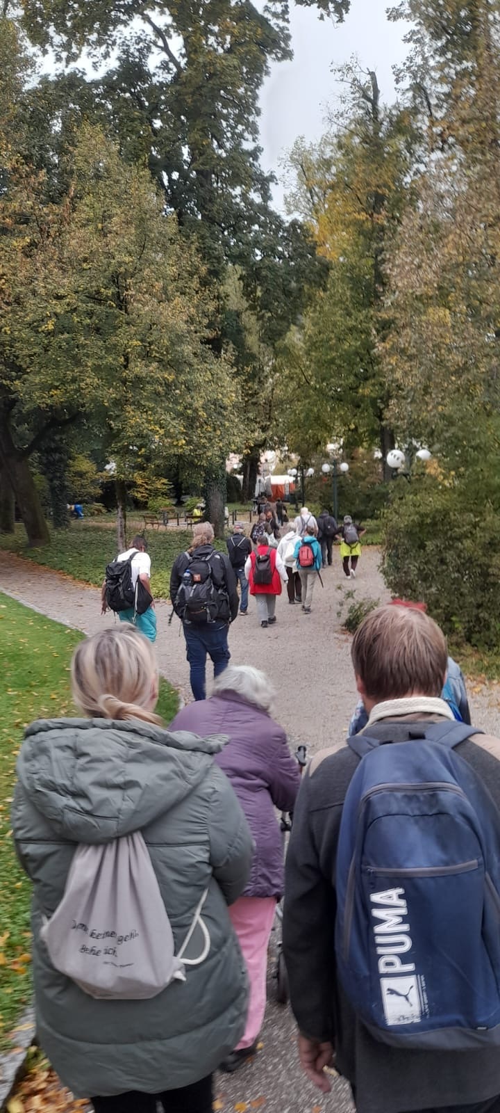 Wir treffen uns frühmorgens am Hauptbahnhof. Gerade in der Früh brauche ich oft etwas länger, bis ich mich wirklich auf eine Konversation einlassen kann. Nicht aber an diesem Morgen. Denn als ich mich der kleinen Gruppe nähere, begrüßen mich sofort viele freundliche Gesichter und ausgestreckte Hände. Die Gespräche reißen nicht ab, während sich immer mehr Menschen zu uns gesellen. Ganz unspektakulär schließt sich auch unser Bischof Manfred an. Ein Teilnehmer hat ihn sofort erkannt und auch ihn herzlich in Empfang genommen. Beim Jausenpakete-Austeilen fällt mir besonders auf, wie heterogen unsere Gruppe ist. Alter, Kleidungsstil, Habitus,… - nichts, das einen wirklich als Gruppe erscheinen lässt, und doch gehören wir zusammen. Schwer zu sagen, ob es diese Ambivalenz ist, die auch andere auf uns aufmerksam macht, oder ob es etwas anderes ist. Klar, wir sind vielleicht manchmal etwas laut, sehr bunt und - vermutlich kann man auch sagen - leicht schräg. Ein chaotischer, gut gelaunter, ca. 35-köpfiger Haufen eben. Aber das trifft wohl auf jede Gruppe zu, wenn man voller Vorfreude einen Ausflug beginnt.