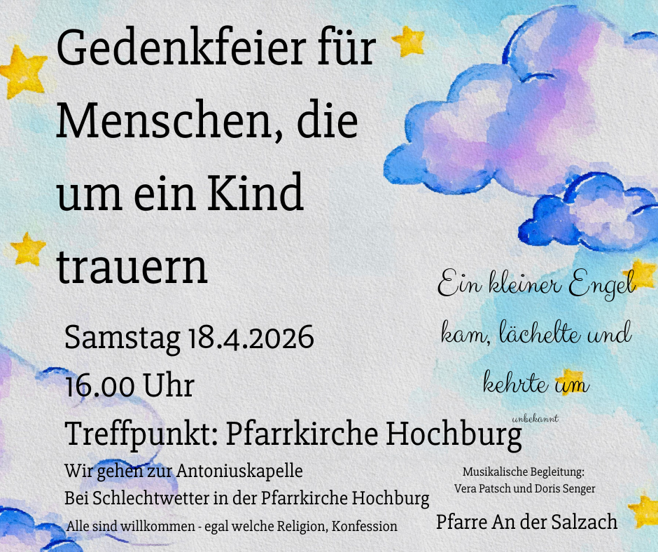 Gemeinsam machen wir uns von der Pfarrkirche auf den Weg zur Antoniuskapelle. Auf diesem Weg möchten wir unseren Herzen nachgehen: spüren, wie nahe uns diese kleinen Engel sind, welche Gefühle in uns aufsteigen und auch die Dankbarkeit wahrnehmen, dass sie zu unserem Leben gehören.