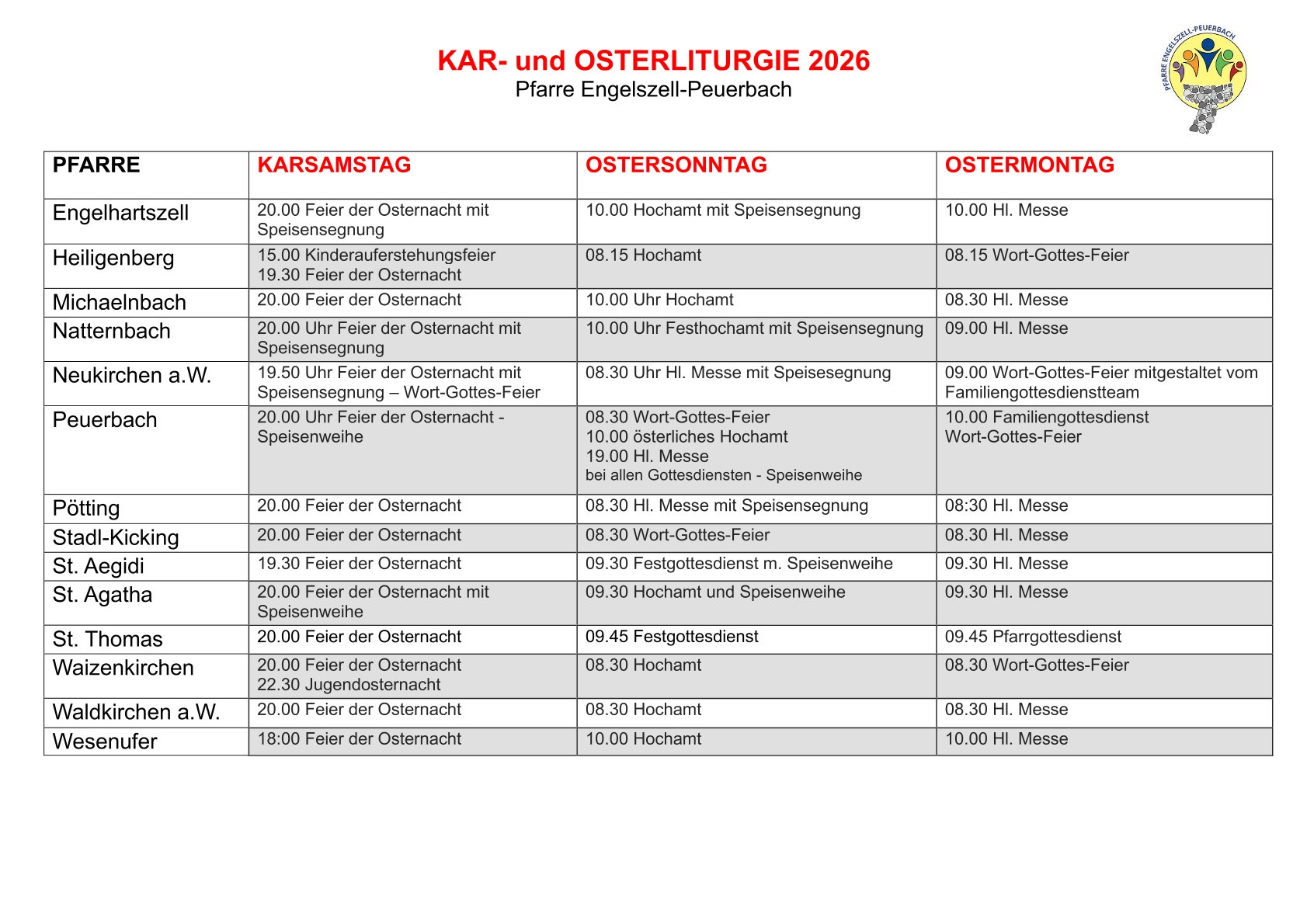 Überblick über Feiern in den 14 Pfarrgemeinden in der Karwoche und Ostern.