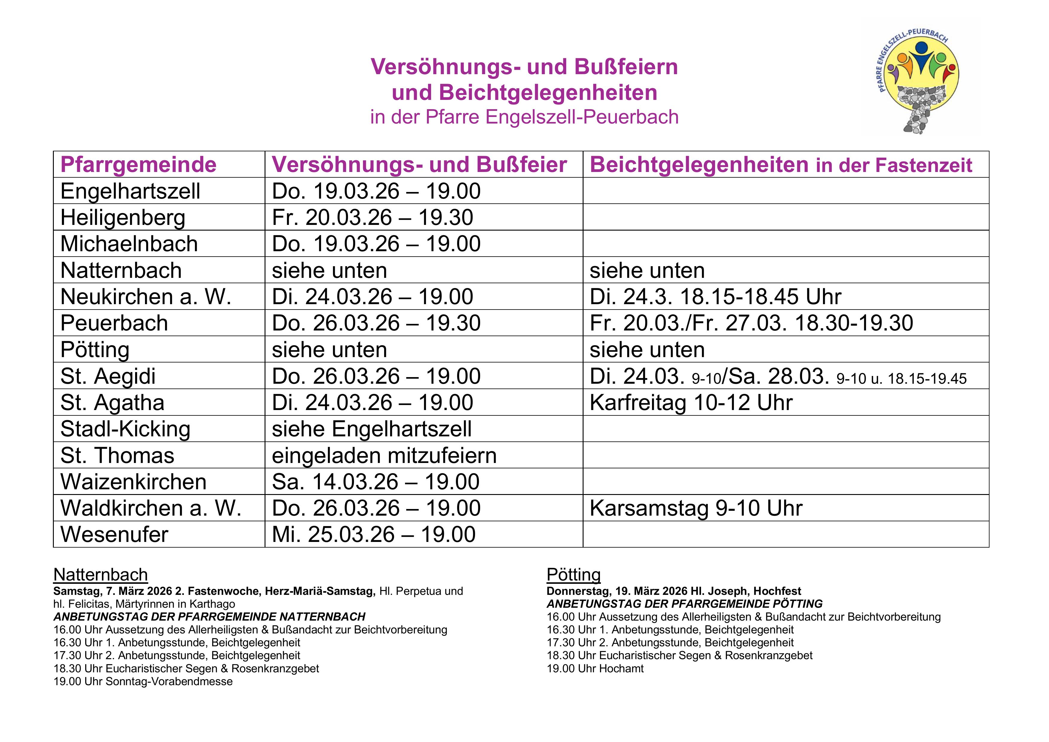 Übersicht über die Beichtgelegenheiten, Buß- und Versöhnungsfeiern der Pfarre Engelszell-Peuerbach.