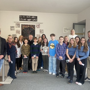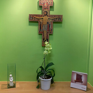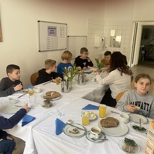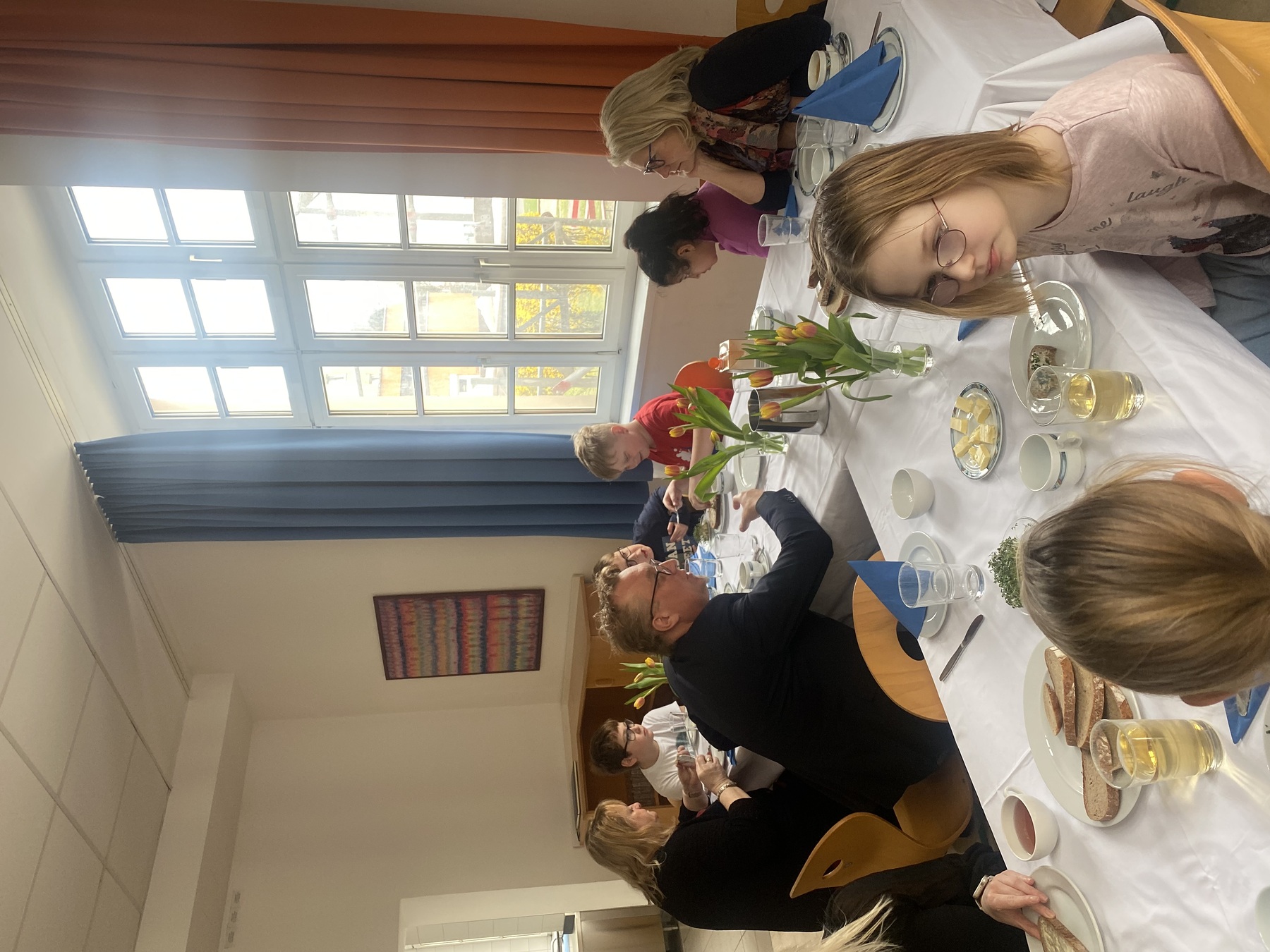 Jedes Jahr wird an das Kind mit dem größten Engagement der Francesco Preis verliehen (kleine weiße Figur). Wir wurden von den Schüler:innen (3B MS) durch die ganze Schule geführt, bekamen ein Frühstück (4. Klasse VS), das zur Fragestunde wurde, und die Erstkommunionkinder sangen zwei Lieder für uns.