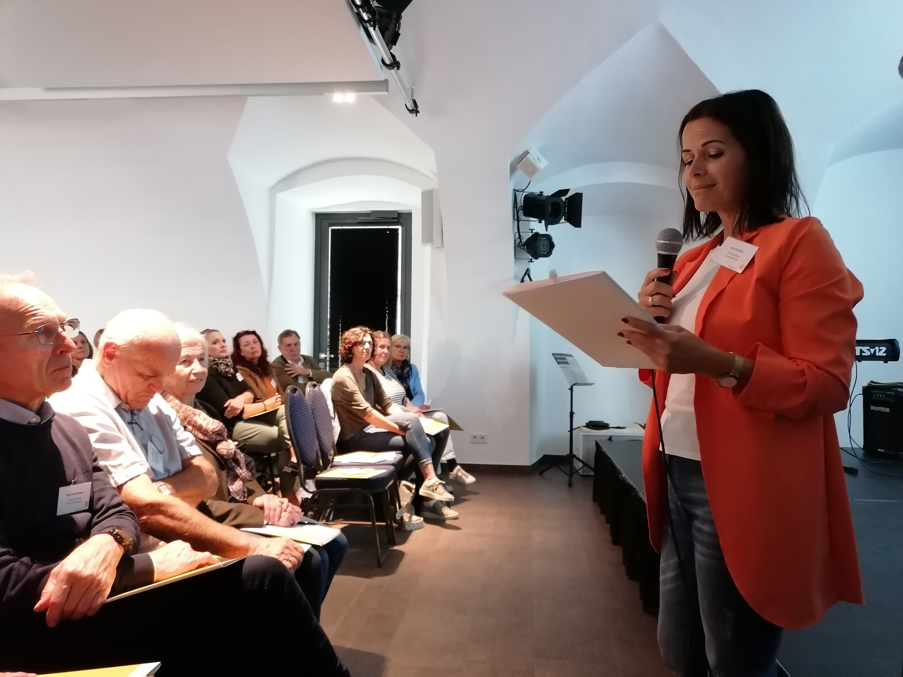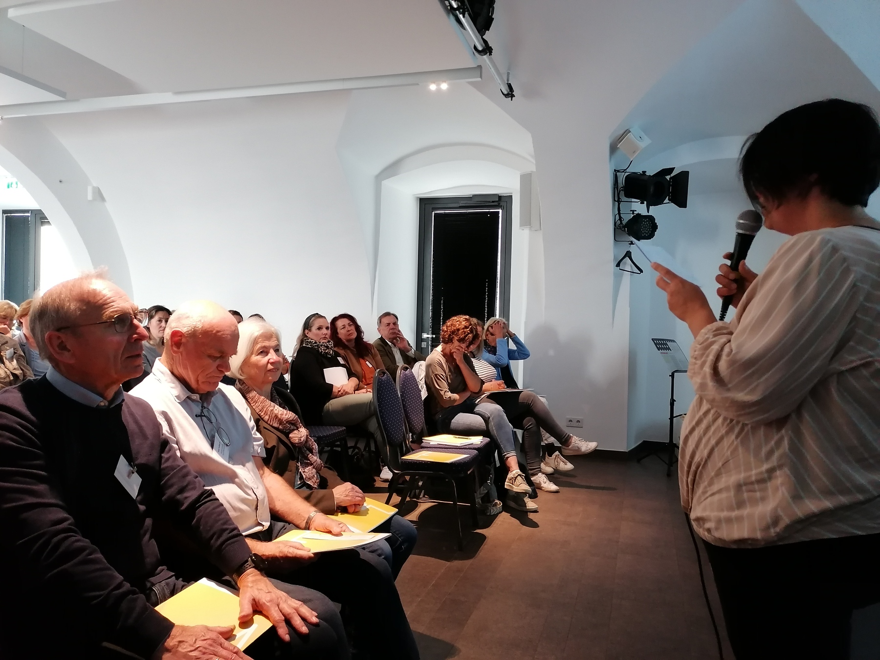 Die Klausur begann um 08:30 Uhr mit einem gemeinsamen Gebet im Kreuzgang der Stiftspfarrkirche Mattighofen. Gestaltet wurde das Gebet von Herrn Pfarrer Dr. Pollhammer sowie den beiden Musikerinnen Susanne Mühlberger und Anna Katharina Schöfegger. Um 09:00 Uhr fanden sich alle Teilnehmenden im Schloss Mattighofen ein. Als erster Programmpunkt stand die Vorstellung der einzelnen Pfarren. Herr Ferdinand Schrattenecker vom Fotoclub Mattighofen zeigte schöne Fotos aus dem Raum Mattighofen. Die Fotopräsentation wurde mit Livemusik begleitet, gespielt von Pianist Dr. Pelz. Nach den Impressionen aus den 16 Pfarren wurde übergeleitet zum Infoteil der Veranstaltung. Frau Irene Huss, Pastoralvorständin der Pfarre Braunau informierte die Hörenden über die Themen: "Die neue Pfarre", "Die neue Pfarrgemeinde". Sie erzählte über Theorie und Praxis und teilte persönliche Erfahrungen und Tipps zur Umsetzung mit. Ebenso standen Herr Pfarrer Sireisky und Herr Dechant Michalowski dem Plenum Rede und Antwort zu Fragen über das kirchliche Leben. Um 15:30 Uhr endete die 1. Klausur des erweiterten Dekanatsrates mit einem Gebet zum Zukunftsweg von Sr. Maria Schlackl SDS "Gebet für Kirche auf dem Weg".