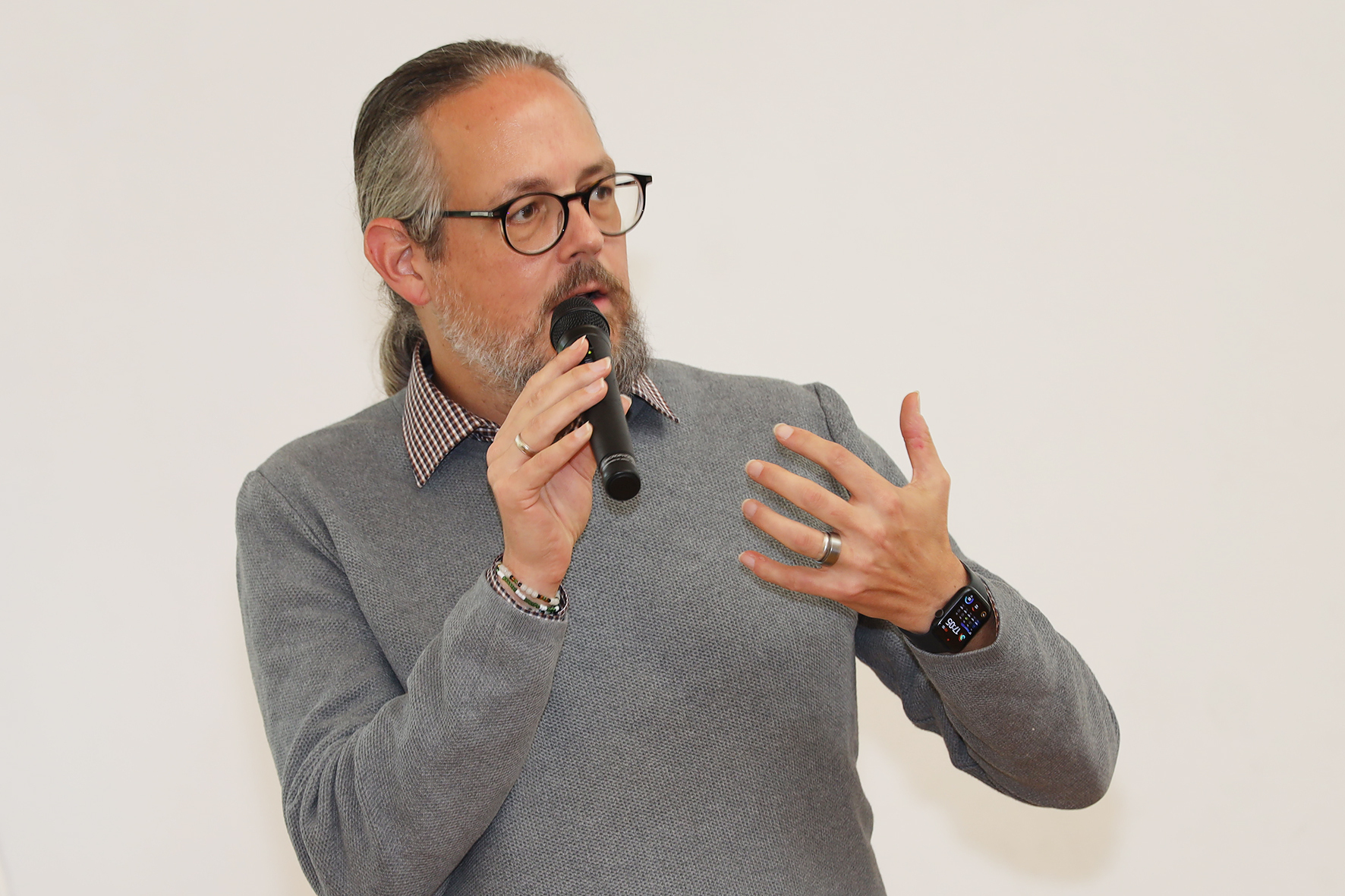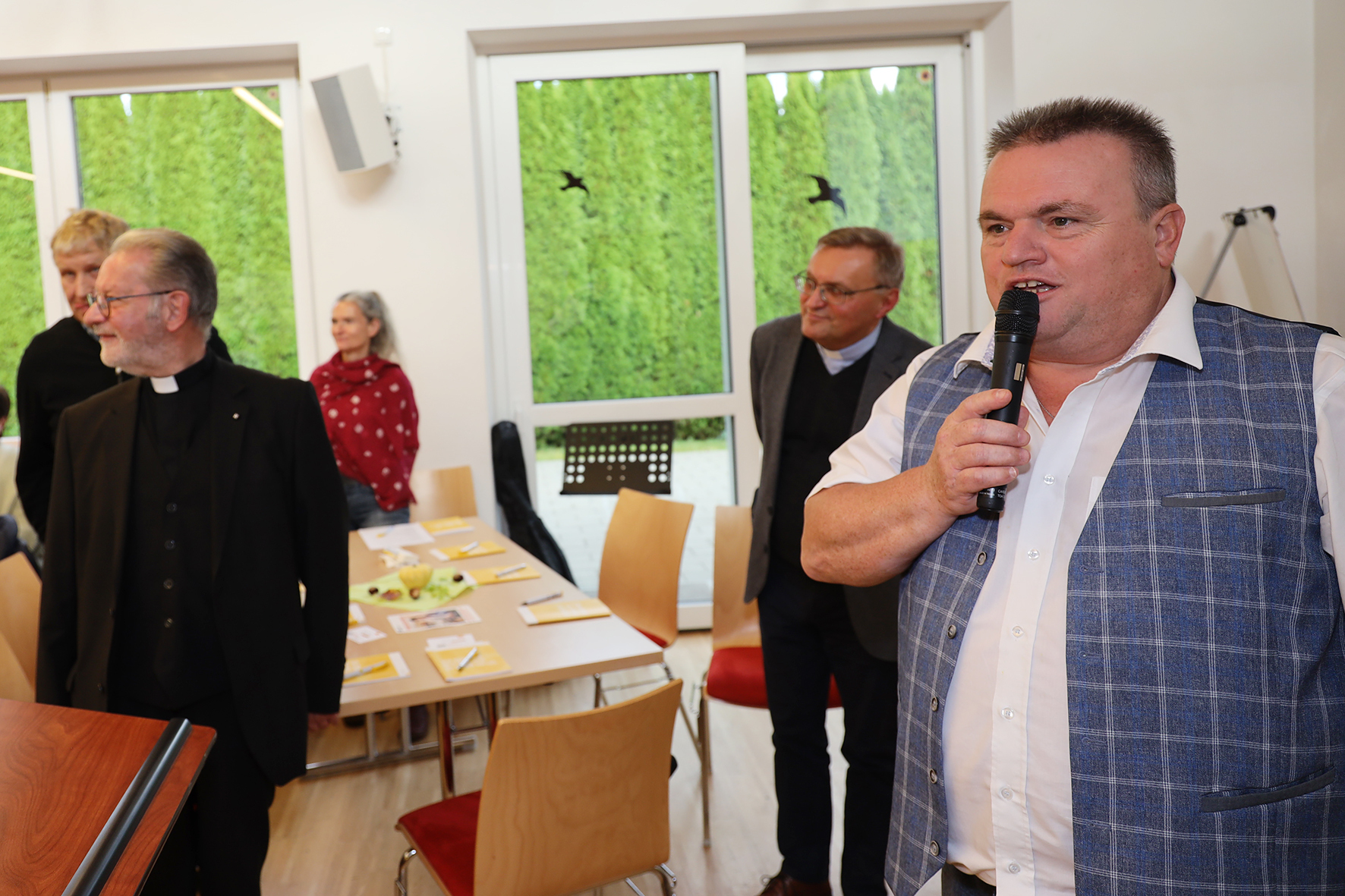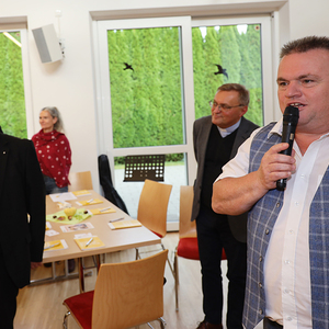 Dechant Marek Michalowski lädt zu Beginn der Veranstaltung die Teilnehmenden zum gemeinsamen Gebet und Singen ein. Er motivierte mit seinem Leitwort „Mit Gottes Geist mutig den Wandel gestalten“ und drückt aus, dass Mut, Vertrauen und Offenheit wichtige Haltungen sind um den Zukunftsweg mitzugehen. Er beruft sich dabei auf zwei ausgewählte Bibelstellen. In Jesaja 43,19 heißt es „Ich mache einen Weg in der Wüste und Flüsse in der Einöde“. Der Herr Dechant ermutigt den Wandel als Zeichen unserer Zeit anzuerkennen und darauf zu vertrauen, dass etwas Neues und Gutes entsteht. Andererseits spricht der Herr Dechant mit der weiteren Bibelstelle Matthäus 5,14 - 16 „Ihr seid das Licht der Welt.“ den einzelnen Pfarrgemeinden ihre jeweilige Bedeutsamkeit zu. Jede und jeder spielt in der Gemeinde eine wichtige Rolle und macht durch das eigene Wirken Gottes Liebe sichtbar.