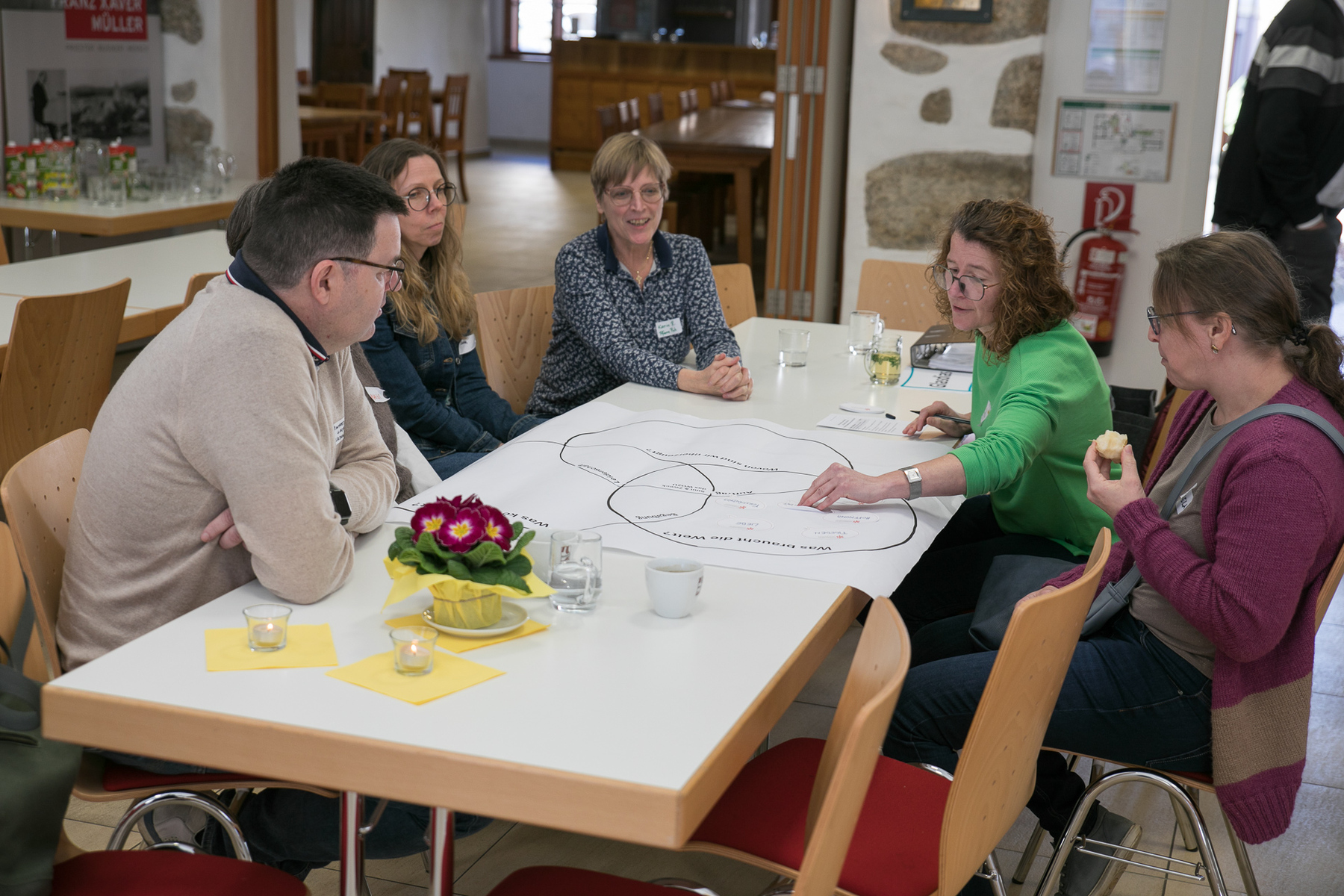Begleitet wurde der Tag aus einem Team der Di özese: Bernadette Hackl, Tobias Renoldner und von Sonja Höhenberger. Sonja erinnerte an die Leitlinien der Diözese Linz, die für die zukünftige Pfarre Orientierung geben: Solidarität, Spiritualität, Qualität und die Nähe zu den Menschen.