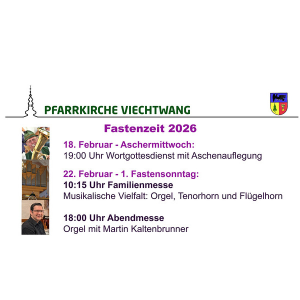 15.02. Aschermittwoch und 1. Fastensonntag Aschermittwoch: 19:00 Wortgottesdienst 1. Fastensonntag: 22.02.2026: 10:15 Uhr Familienmesse: Musikalische Vielfalt 18:00 Uhr: Mit Martin Kaltenbrunner an der Orgel weiter lesen ...: Aschermittwoch und 1. Fastensonntag