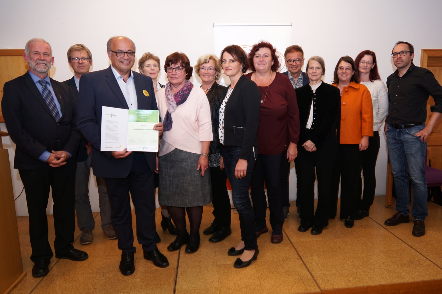 Der Pfarre Niederneukirchen wurde für ihr „von den Produkten bis zur Information, von der Mobilität bis zur Spiritualität konsistent durchdachtes und gestaltetes Pfarrfest“ am 30. Juni 2019 der 1. Preis zuerkannt. Aus den vielen einzelnen Komponenten ist ein Fest entstanden, das praktisch in allen Belangen das Maximum sowohl an Regionalität als auch an ökologischer Erzeugung und fairen Preisen erreicht. So kauften die Verantwortlichen nur wenige Produkte in konventionellen Lebensmittelmärkten ein. Wo immer es möglich war, bezogen sie ihre Speisen und Getränke stattdessen von örtlichen Direktvermarktern, die noch dazu fast alle ökologisch wirtschaften. So konnten die Erzeuger faire Preise erzielen und die Transportwege auf ein Minimum reduzieren. Im Vergleich mit allen anderen Einreichungen war in Niederneukirchen der Anteil von Bioprodukten am höchsten: Milch, Brot, Salat, Kraut, Kartoffeln und alkoholfreie Getränke waren bioregional, und das Lammfleisch kam aus sehr tiergerechter Haltung. Ein attraktives vegetarisches Angebot lud zur Reduzierung des Fleischverzehrs ein. Die Direktvermarkter erhielten darüber hinaus die Möglichkeit, ihre Produkte und deren Herstellung im Rahmen des Pfarrfests darzustellen, worauf auch auf der ausliegenden Speisekarte hingewiesen wurde. Für den Hinweg zum Fest wurde ausdrücklich dazu aufgerufen, nichtmotorisiert zu kommen. Für den Rückweg wurde ein Bringdienst per Elektroauto angeboten. Schließlich wurde die Schöpfungsthematik bereits im vorangehenden Familiengottesdienst angesprochen und so eine Verbindung zwischen Liturgie und Pfarrfest hergestellt.