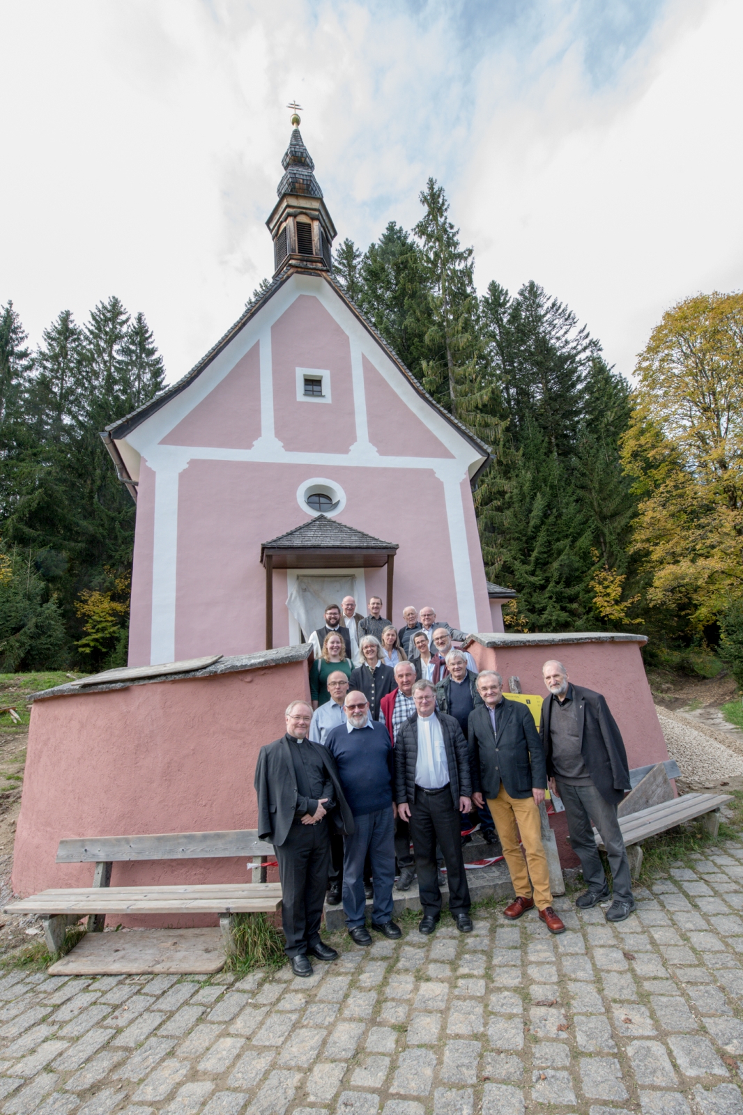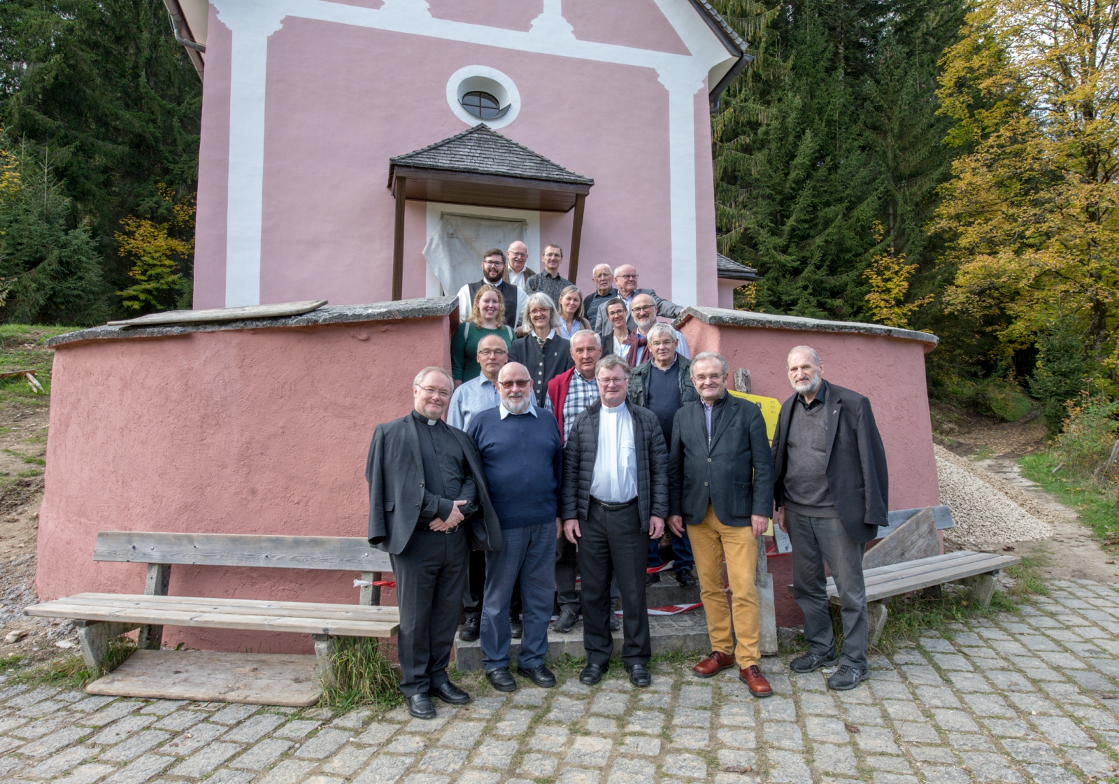 Am Montag, 14. Oktober war nach dem Mittagessen gemeinsames Unterwegssein in der Natur angesagt. „Es ist wichtig, dass wir einmal nicht nur nebeneinander dahinwerken und jeder bzw. jede die eigene Arbeit tut, sondern dass wir miteinander auf dem Weg sind“, so Bischof Scheuer im Jahrbuch 2020. Dieses Anliegen setzte er mit Generalvikar Severin Lederhilger und Bischofsvikar Wilhelm Vieböck bei der Visitation in die Tat um. Die Visitatoren unternahmen mit knapp 20 SeelsorgerInnen aus dem Dekanat bei wunderschönem Herbstwetter eine kleine Wanderung in Gosau – mit ökumenischem Akzent: Der Weg führte von der katholischen Kirche zur evangelischen Kirche, wo es zu einer herzlichen Begegnung mit Pfarrerin Mag.a Esther Scheuchl kam. Diese berichtete aus dem Pfarralltag und betonte das gute ökumenische Miteinander. Danach ging es weiter zur Kalvarienbergkirche, die derzeit renoviert wird. Sie ist ein Symbol für die in Gosau gelebte Ökumene und wird von katholischen und evangelischen Gläubigen gleichermaßen genutzt. Das Gehen an der frischen Luft endete beim „Haus der Begegnung“ der Kreuzschwestern“ in Gosau, wo anschließend die Pastoralkonferenz stattfand.
