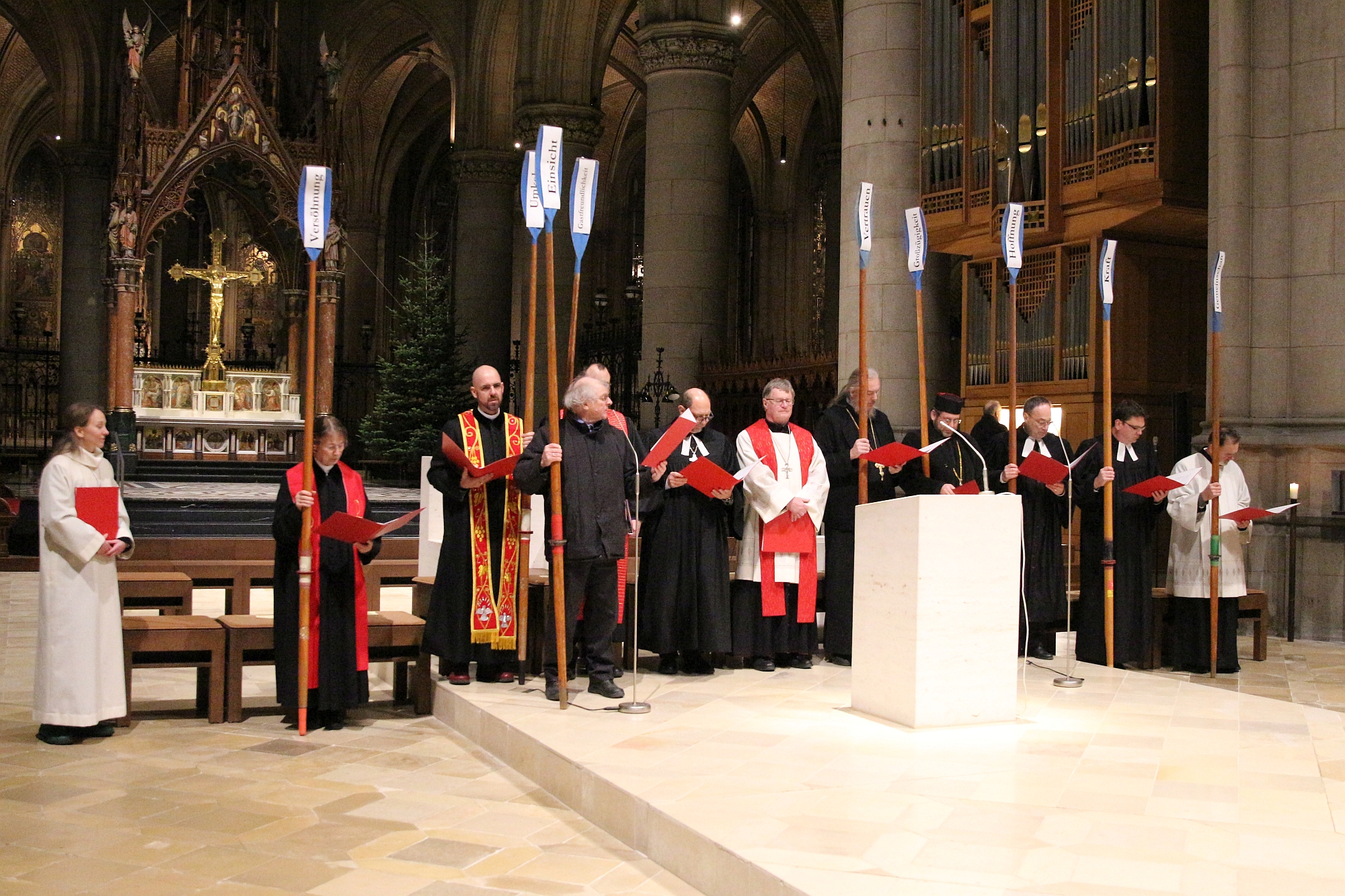 Das Bild des Schiffes als Symbol für die christliche Kirche begleitete durch den ökumenischen Gottesdienst. Die VertreterInnen der christlichen Kirchen trugen beim Einzug in den Mariendom Ruder, auf denen die Wörter „Einsicht“, „Hoffnung“, „Umkehr“, „Kraft“, „Großzügigkeit“, „Versöhnung“, „Gastfreundlichkeit“, „Vertrauen“ und „Gemeinschaft“ zu lesen waren – jahrtausendealte Haltungen des Christentums, die das Schiff auf dem richtigen Kurs halten und um die bei den Fürbitten gebetet wurde. Auch die Bibelstellen griffen das Thema auf: mit dem Schiffbruch des Paulus (Apg 27,9–28,2) und dem Sturm auf dem See, dem Jesus Einhalt gebietet (Mt 8,23–27).