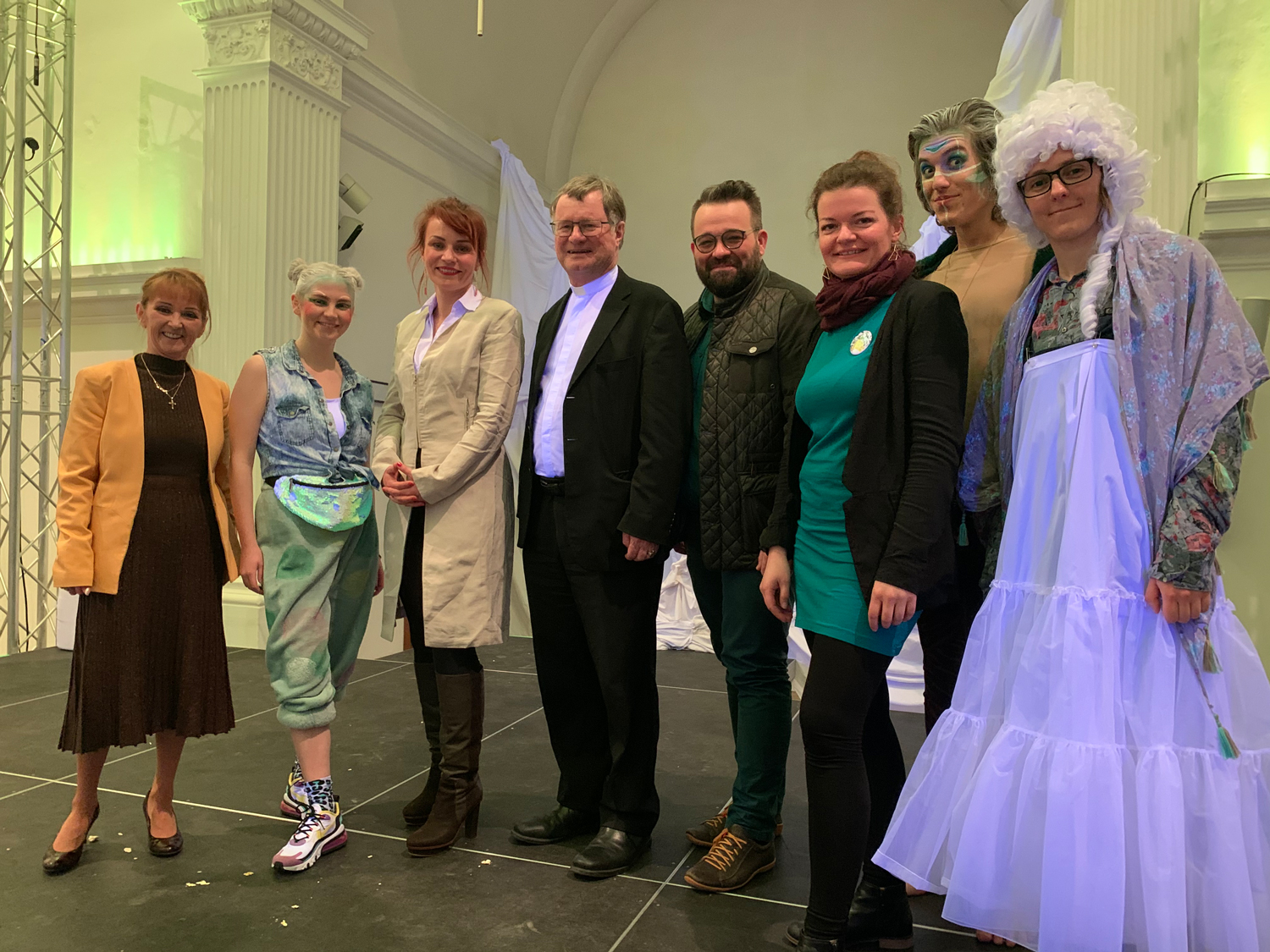 Foto 2: V.l.: Gemeinderätin Erika Wundsam (SPÖ), Felicitas Hager als „Puck“, Regisseurin Elisabeth Kreil, Bischof Dr. Manfred Scheuer, Mag. Daniel Neuböck (Leiter Katholische Jugend OÖ.), MMag.a Teresa Kaineder (Jugendpastoral Dekanat Linz-Nord), Moritz Merten als „Oberon“, Manuela Walchshofer als „Thisbe“.