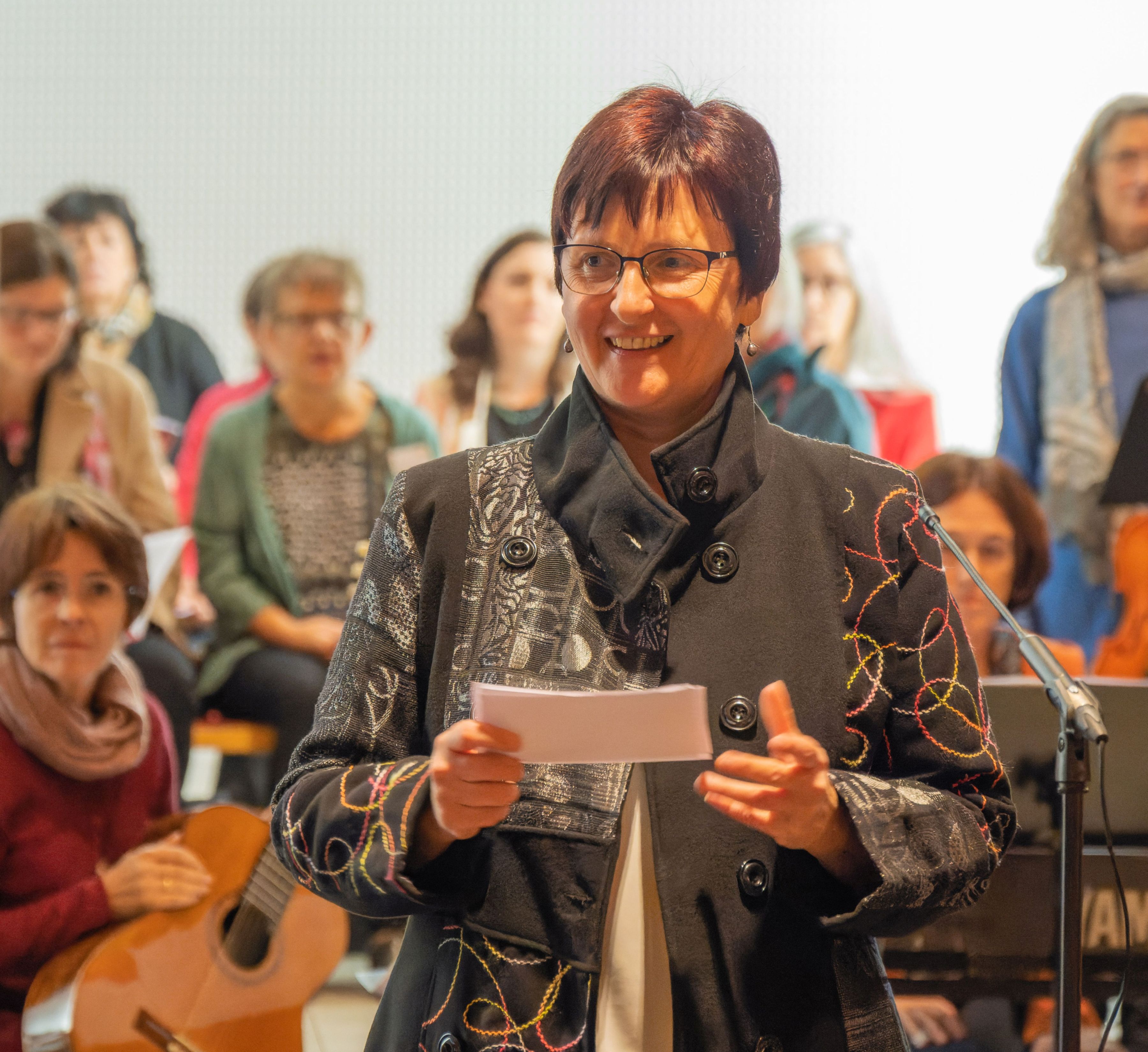 Die Feier begann mit einer Frauenliturgie, die unter dem Thema „Frau – wir erinnern dich!“ stand. Das Konzept stammt von Brigitte Enzner-Probst, die Musik wurde von Claudia Mitscha-Eibl komponiert. Die Besonderheit daran: Den liturgischen Elementen sind biblische Texte zugeordnet, die Frauen in den Mittelpunkt stellen und die wie die klassischen Elemente eines Gottesdienstes vertont sind. Das Thema bezieht sich auf die Bibelstelle aus dem Matthäusevangelium (Mt 26,6-13), in der eine Frau Jesus mit kostbarem Öl salbt und er ihr verspricht, dass man sich immer an sie und an das, was sie getan hat, erinnern wird. Durch die Frauenliturgie führten die beiden Seelsorgerinnen Doris Wierzbicki und Adelheid Schrattenecker, beide Mitglieder der Frauenkommission. Musikalisch mitreißend gestaltet wurde die Feier von einem Frauenchor und Instrumentalist:innen unter der Leitung von Johanna Strasser-Lötsch. Auch die Komponistin Claudia Mitscha-Eibl feierte mit und musizierte sowohl im Chor als auch im Instrumentalensemble.