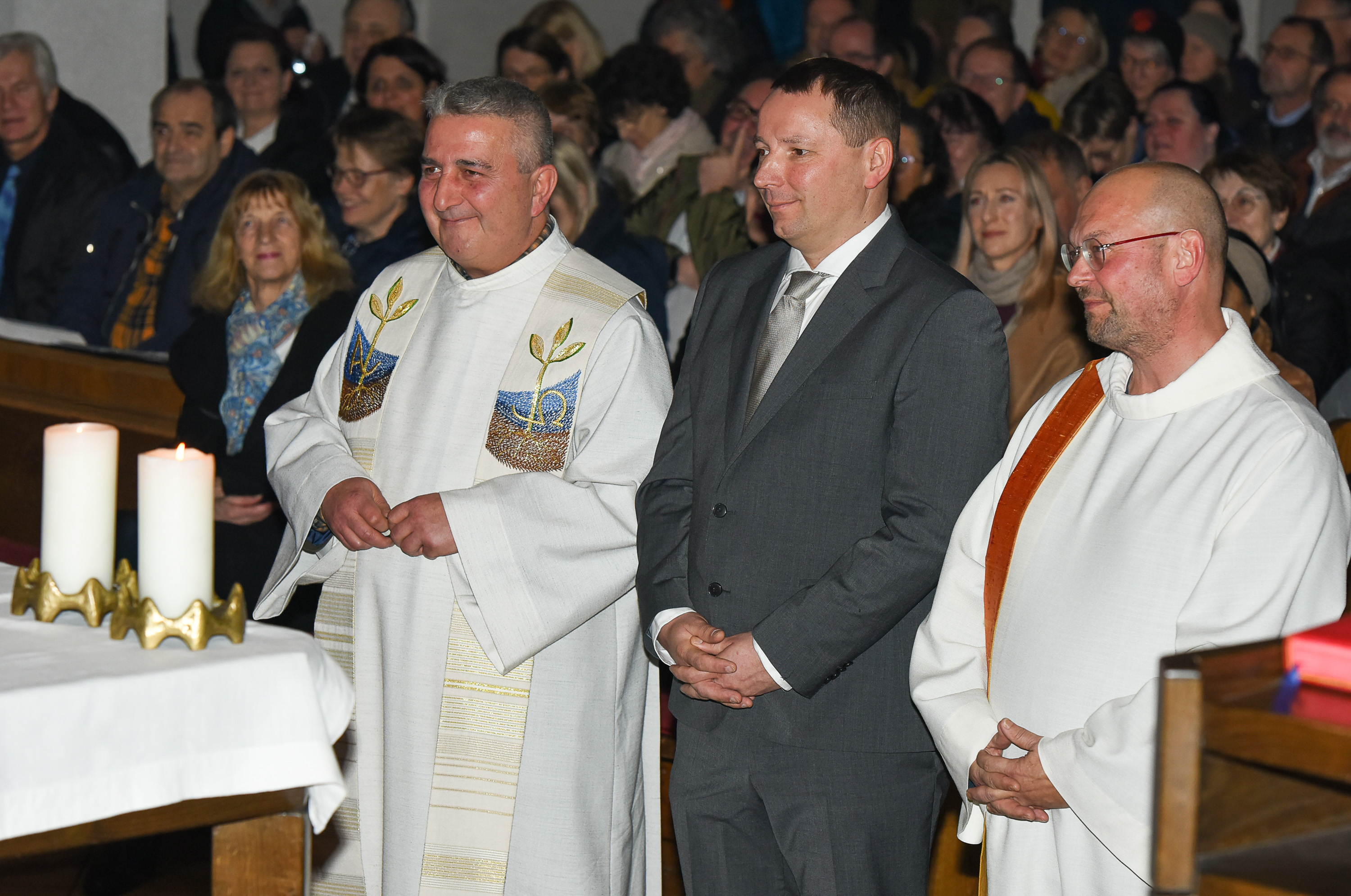 Foto 6, Foto 7 und Foto 8: Vor der versammelten Feiergemeinde bekannten die Ernannten – Pfarrer, Pastoral- und Verwaltungsvorstand – ihren Glauben. Eingebettet war dieses Glaubensbekenntnis in das Glaubensbekenntnis aus Mozarts Krönungsmesse und das Credo aus den „Invocationes“ von Balduin Sulzer. © Dörn