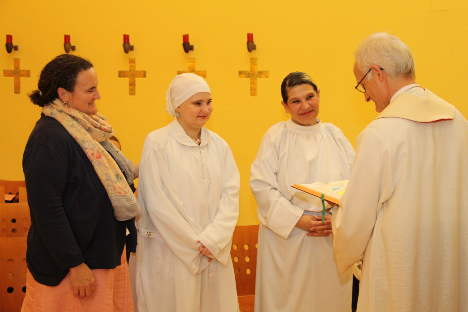 Beide Frauen setzen ihr Vertrauen auf Gott und schöpfen große Kraft aus dem Glauben. Für Rebekka ist die Bibelstelle aus dem Markus-Evangelium sehr wichtig, in der Jesus die Tochter des Jairus auferweckt mit den Worten: „Talita kum“ – Mädchen, steh auf. Xheraldina fühlt sich der Gottesmutter Maria sehr verbunden. Deshalb haben sie als Taufnamen „Rebekka Talita“ und „Xheraldina Maria“ gewählt. Es war der innige Wunsch der beiden Frauen, von Bischof Schwarz getauft und gefirmt zu werden – ein Wunsch, den dieser mit großer Freude erfüllte. Den Gottesdienst zelebrierten mit ihm Pater Werner Hebeisen und Don Nikson Shabani, Seelsorger für die albanische Gemeinde in Wien. Die gesamte Feier wurde auf Englisch gehalten.