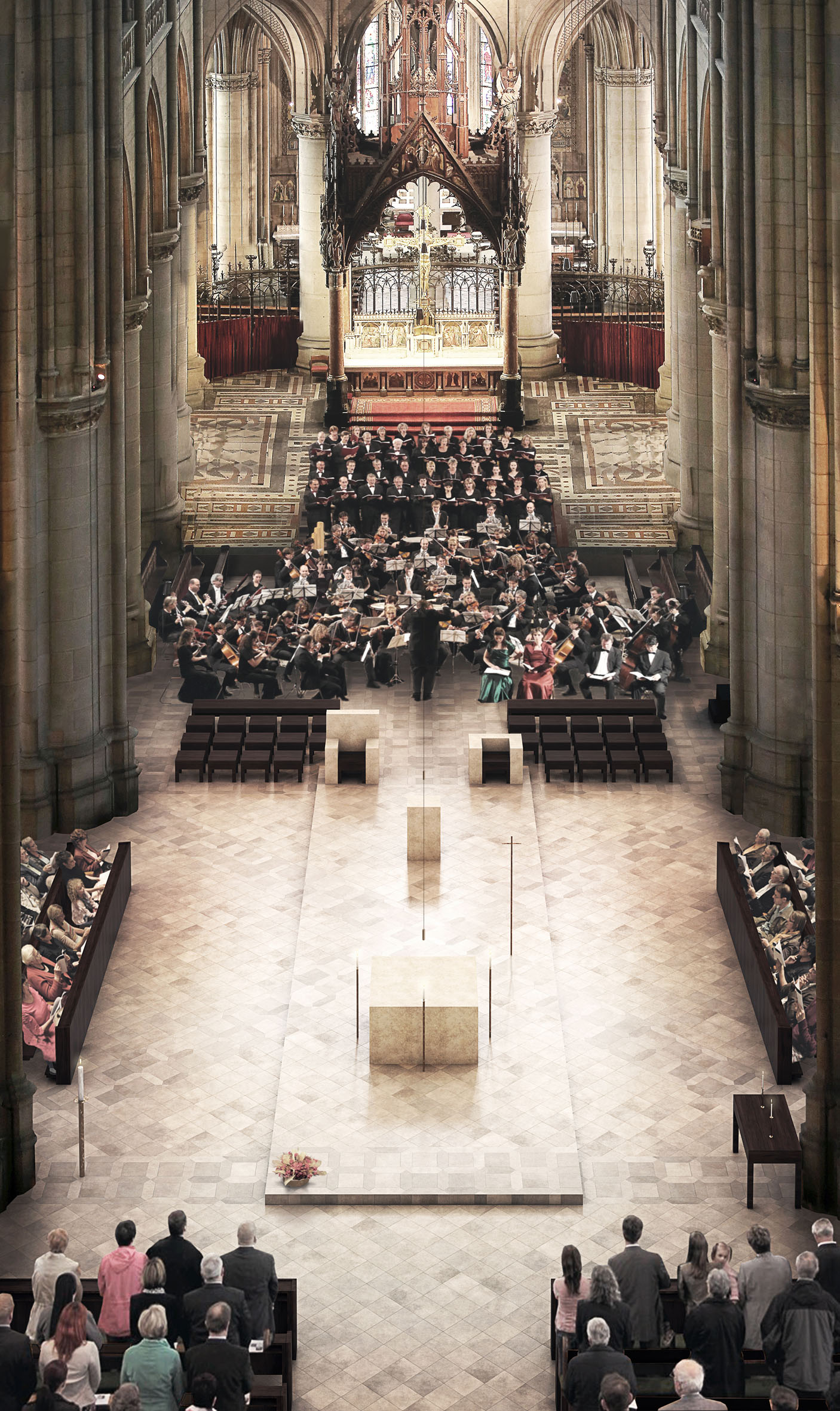 Auch Prof. Wilfried Kuehn vom Architekturbüro KUEHN MALVEZZI in Berlin zeigte sich begeistert von der Herangehensweise, die in dieser Konstellation selten sei. „Dass Architekten und Künstler von der ersten Sekunde an gemeinsam am Konzept gearbeitet haben, macht seine Besonderheit und sein Potential aus. Man ist gefordert, über die eigene Disziplin hinauszudenken und den Raum in seiner Materialität und Wirkung zu sehen“, so Kuehn. Die vorgegebene Idee sei gewesen, die Gemeinschaft so zusammenzuführen, dass die Idee der versammelten Gemeinde auch ihren räumlichen Ausdruck finde. „Die Vierung ist ein großer Raum und eine große Ansage – sie heißt viele Menschen willkommen, aber auch wenige Personen sollen sich als versammelte Gemeinde empfinden. Es galt also, das Atmen des großen Raums von klein bis groß erfahrbar zu machen – genauso wie die neugotische Idee, die im Laufe der Zeit durch Veränderungen verstellt wurde“, schilderte der Architekt die Herausforderung. „Es ist wunderbar, wie Kirche sich in ihrer Raumform aktualisiert – sie ist ja kein Museum, sondern gelebter Ort“, so der Architekt.