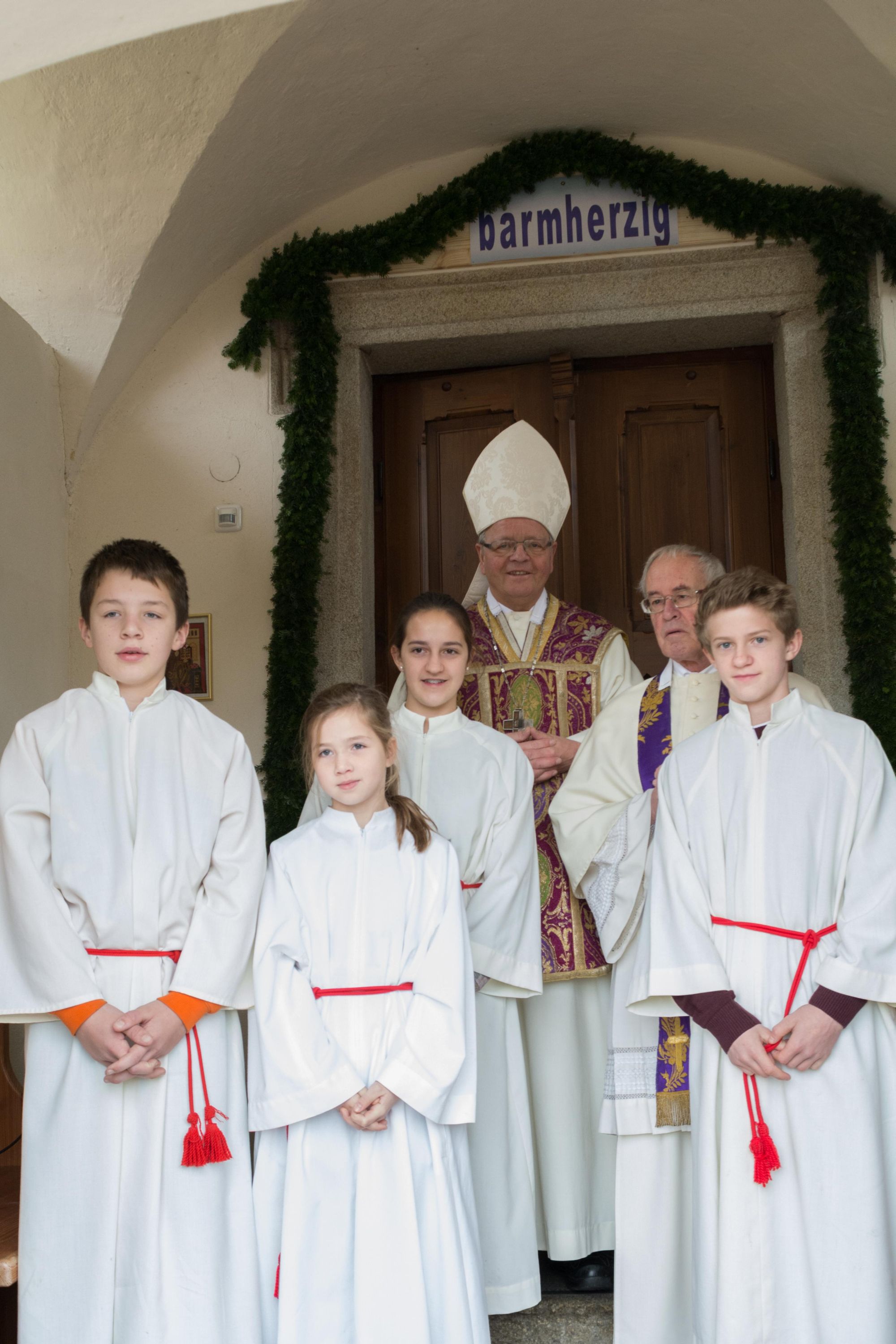 In der Wallfahrtskirche Maria Schmolln wurde die „Pforte der Barmherzigkeit“ von Bischofsvikar Dr. Johann Hintermaier feierlich eröffnet. Blaue Teppiche mit der Aufschrift „barmherzig“ machen unübersehbar auf das Heilige Jahr aufmerksam und weisen den Weg zur Pforte der Barmherzigkeit. Eine Holzkonstruktion in Bogenform, errichtet von der Zimmerei des Pfarrgemeinderatsobmanns Hermann Schachner, betont die Türen, die von der Hauptkirche in die Gnadenkapelle führen. Bei genauerer Betrachtung erkennt man die Gestaltung aus unterschiedlichen Hölzern – in Anlehnung an die Menschen, die wir – „aus verschiedenen Hölzern geschnitzt“ – so verschieden sind, aber doch zusammengehören und das tragende Miteinander das Schöne und Wesentliche ist. Dezent sind darauf die sieben neuen Werke der Barmherzigkeit von Bischof Joachim Wanke festgehalten. Ein integrierter Schriftenstand bietet pastorale Themenbehelfe und Barmherzigkeitslichter. Bischofsvikar Dr. Johann Hintermaier segnete die Pforte mit den Worten: „Segnen heißt: Gutes sagen. Möge uns, wenn wir durch diese Pforte gehen, geschenkt sein, dass wir gute Worte zueinander sprechen, dass gute Worte zu uns gesprochen werden, dass der Segen Gottes auf uns und durch uns in diese Welt komme.“ Barmherzigkeit sei eine Haltung des Mitfühlens, der Vergebung und des Neuanfangs, so Hintermaier. „Gott öffnet uns auf unserem Lebensweg immer wieder Tür und Tor, ja sein Herz, er kommt uns entgegen. Wenn wir in unseren Haltungen unser Herz ins Spiel bringen – offenherzig werden –, können wir Gottes Liebe und Barmherzigkeit durch uns sichtbar und erfahrbar machen“, ermutigte der Bischofsvikar.