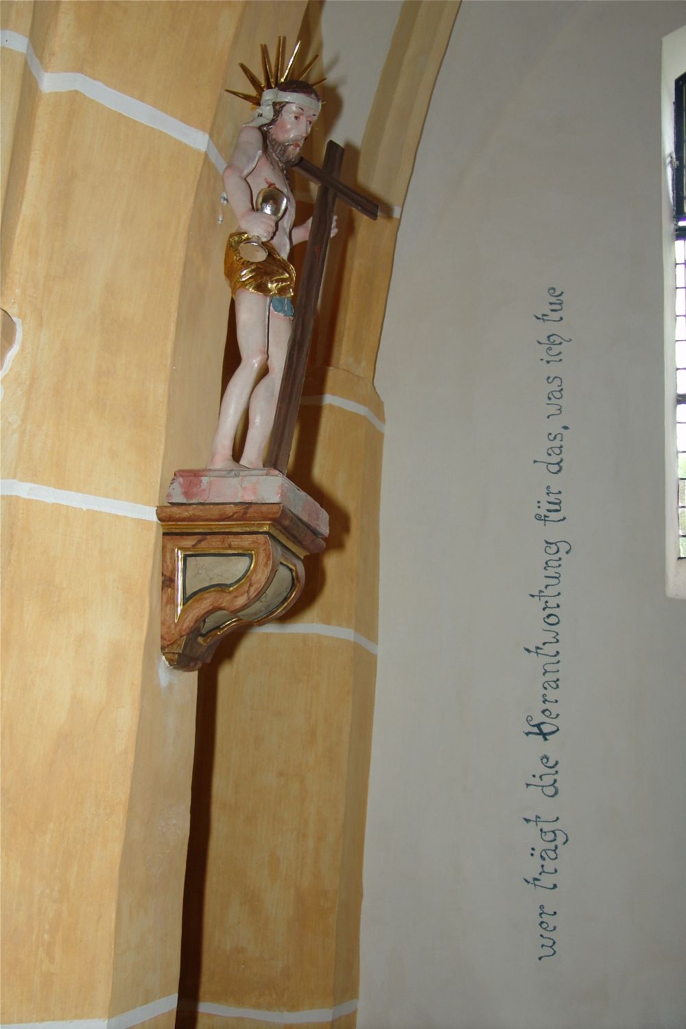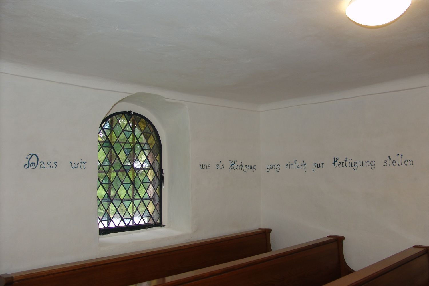 Es war die Idee von Mayer und Barth, die Kirche als „Gedanken- und Entscheidungsraum“ zu gestalten. Die St. Radegunder Kirche ist der Ort einer umstrittenen Gewissensentscheidung. Räumlich verbunden mit den sterblichen Überresten im Altar sind Gedankenfragmente von Franz Jägerstätter, der einmal in diesem Raum gesessen, gebetet und nachgedacht hat, sowie Gedanken aus seiner Umgebung. Diese wurden in die Mauern der Kirche gestickt, laufen weiter auf den Bänken und am Boden der Kirche. Ausgehend von Dokumenten und Interviewrecherchen wurden für diese Schriftkomposition Gedanken gesucht und weitergeführt, die auch heute so gedacht oder gesagt werden könnten. Bewegen sich BesucherInnen durch den Kirchenraum, werden einzelne Sätze wahrnehmbar und verschwinden wieder. Die Gedanken lauten etwa: „wenn wir das Gegenteil von dem tun, was wir beten“ oder „weil man sich am ganzen Weltgeschehen für schuldlos hält“.