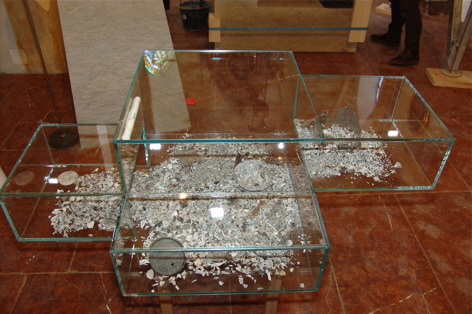Das Reliquiar ist ein geschlossener, komplexer Glaskörper, der sich exakt in den Hohlraum zwischen den beiden Sandsteinblöcken des Altars einfügt und sich in die vier Öffnungen des Kirchengebäudes öffnet. Die Brandreste und die Reste der originalen Urne bedecken den Boden dieses kreuzförmigen Körpers. Jede Seite des Altars erlaubt Einblicke in diesen Raum. Von der vorderen Öffnung ist der Deckel der originalen Urne mit den Inschriften gut lesbar zu sehen.