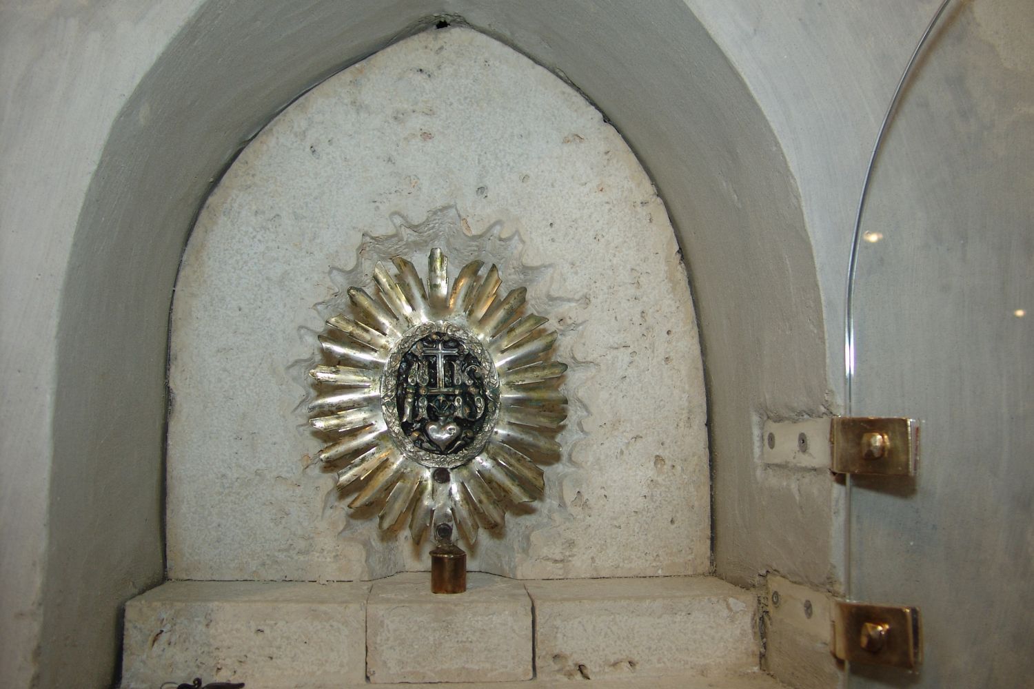 Foto 13: Altar mit Reliquien und Ostensorium (Christus- und Marienmonogramm im Strahlenkranz)
