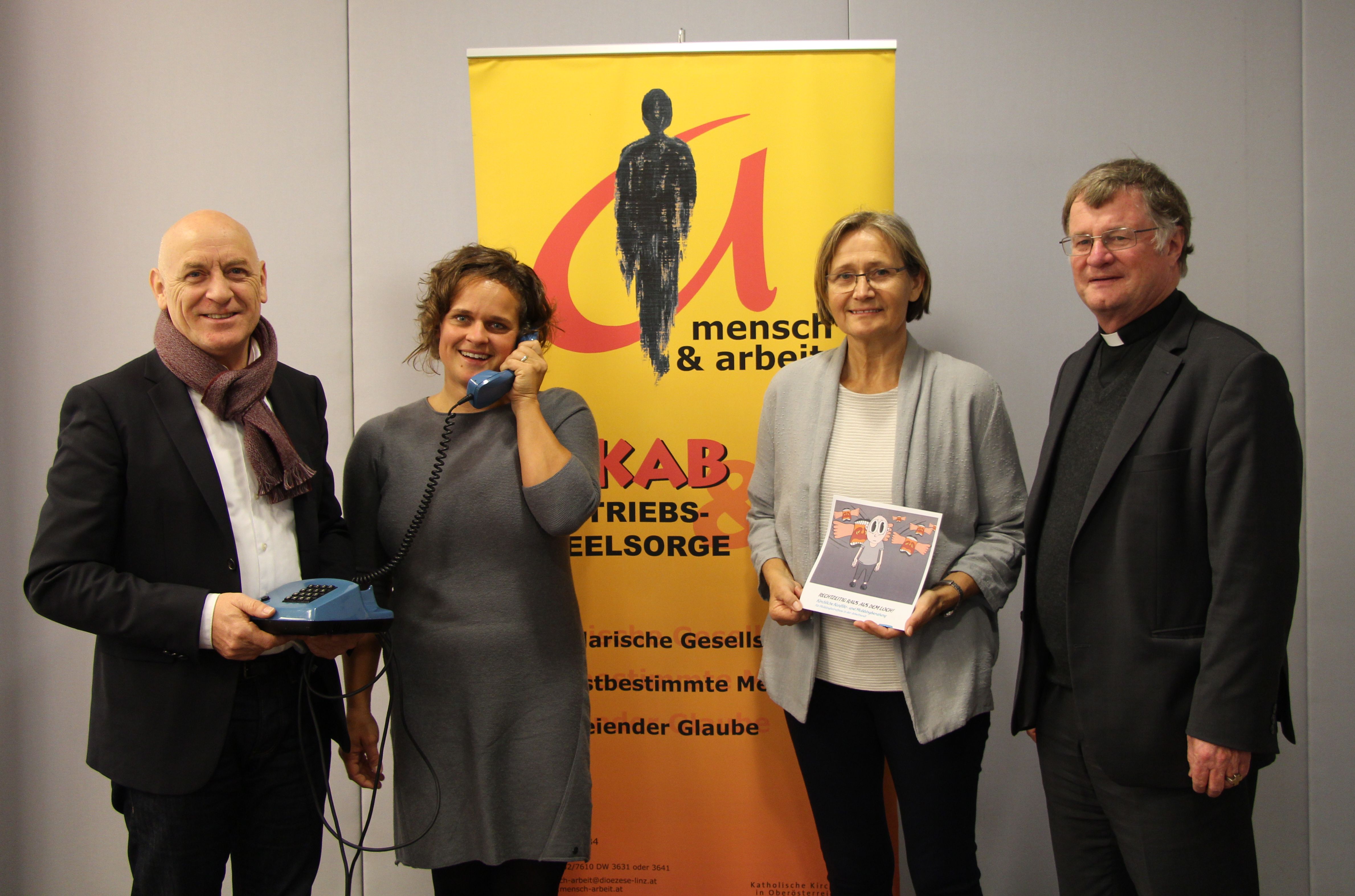 Foto 1: V. l.: DI (FH) Karl-Heinz Hellinger (Mobbing-Beauftragter der Diözese Linz und Berater am Mobbing-Telefon), Mag.a Michaela Pröstler-Zopf (Referentin Betriebsseelsorge OÖ und Mobbing-Beraterin), Mag.a Anna Wall-Strasser (Leiterin Betriebsseelsorge OÖ) und Bischof Dr. Manfred Scheuer.