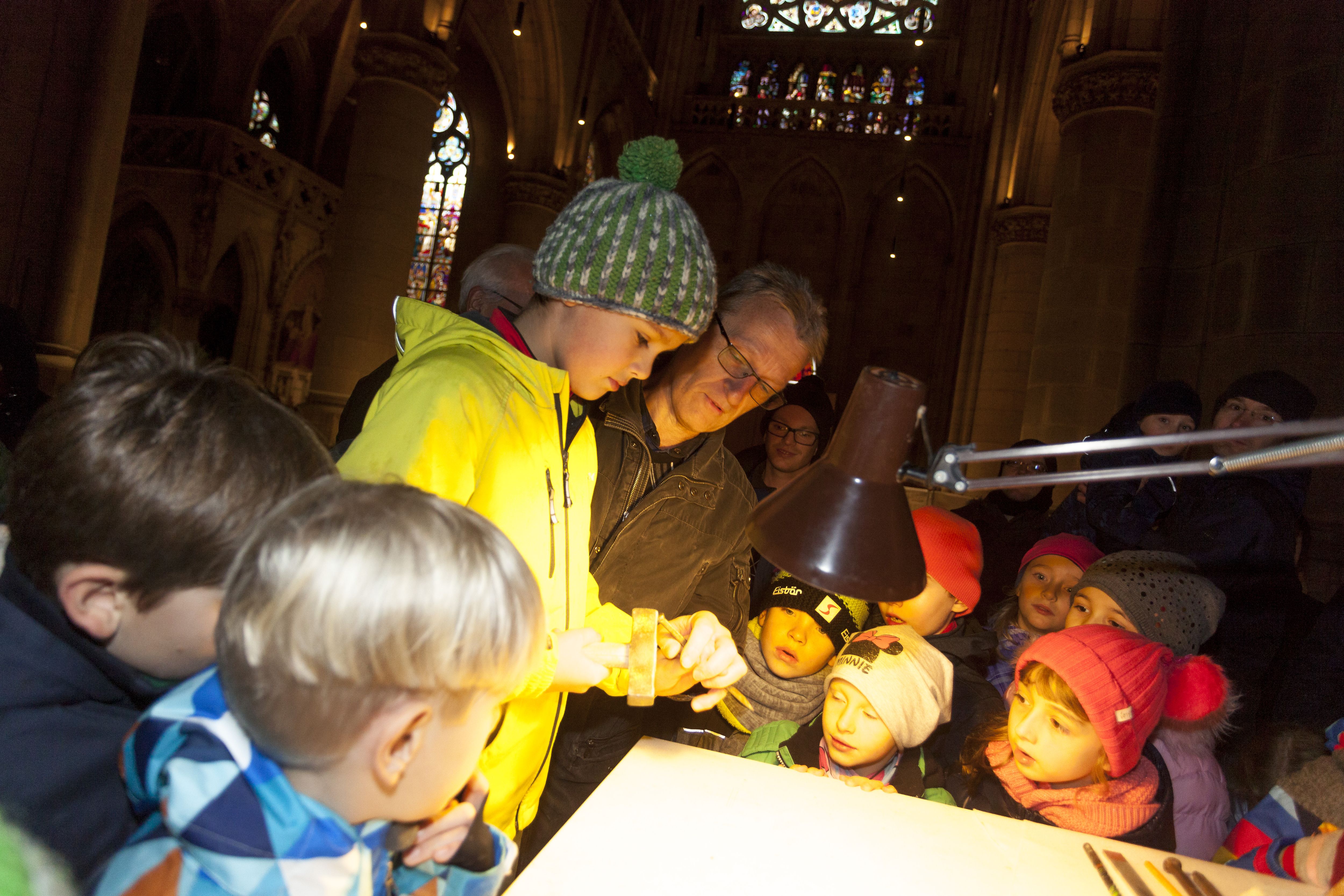 Die Begeisterung bei den Kindern war groß, alle wollten das Meißeln ausprobieren. Bei aller Freude und Aufregung herrschte eine gespannte und konzentrierte Stille – alle Beteiligten spürten das Besondere dieses Moments. Mitten im dunklen Dom, das auf dem Stein vorgezeichnete Kreuz nur von einer Tischlampen-Konstruktion beleuchtet, konnten sich die Kinder im neuen Altar „verewigen“. Manche konnten gar nicht genug bekommen. „Darf ich noch einmal?“, wurde der Steinmetz mehrmals gefragt, als alle einmal drangekommen waren. „Aber sicher! Alles, was du machst, muss ich nicht machen“, freute sich Fraundorfer über jede Unterstützung. Eine Getränkekiste diente als Podest, damit die „Steinmetz-Lehrlinge“ auch in der richtigen Höhe arbeiten konnten. Behutsam führte Fraundorfer die kleinen Hände, die sehr ehrfürchtig mit Hammer und Meißel umgingen. Auch einige Erwachsene bearbeiteten mit großem Respekt den Stein, stellten sich aber bei weitem nicht immer so geschickt an wie die Kinder. „Mama, du machst das falsch“, kam auch postwendend die Belehrung durch die kleinen „Profis“.