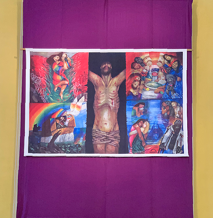Heuer als neue Besonderheit: Auf der großen Wand hinter dem Altar der Riedbergkirche wurden mithilfe eines Beamers riesige Projektionen gezeigt, von animierten Kerzen, über große fliegende Friedenstauben bis hin zum stimmungsvoll animierten Ausleuchten unseres großen Altarbildes.