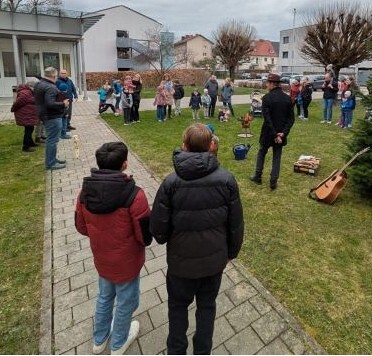 Die KFB-Riedberg erinnerte humorvoll an die Sanierungsarbeiten in und um die Riedbergkirche.