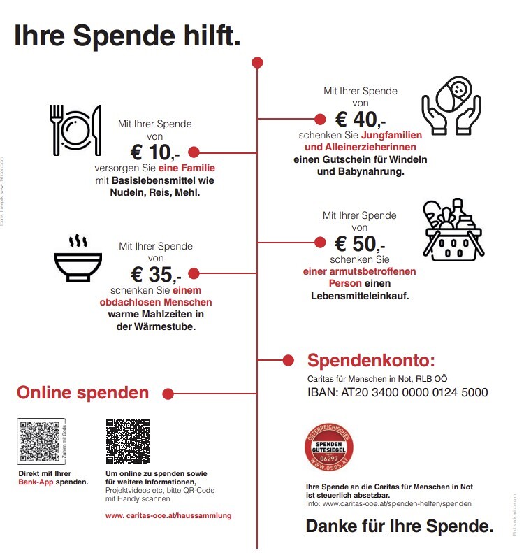 Gerade die Spenden aus der Haussammlung ermöglichen der Caritas in solchen Situationen rasche, unbürokratische und zugleich nachhaltige Hilfe: Lebensmittelgutscheine, Zuschüsse für Strom und Heizung, beratende Gespräche, sichere Schlafplätze, medizinische Unterstützung und warmes Essen. Hilfe, die dort ankommt, wo sie dringend gebraucht wird – und zwar dann, wenn es zählt.