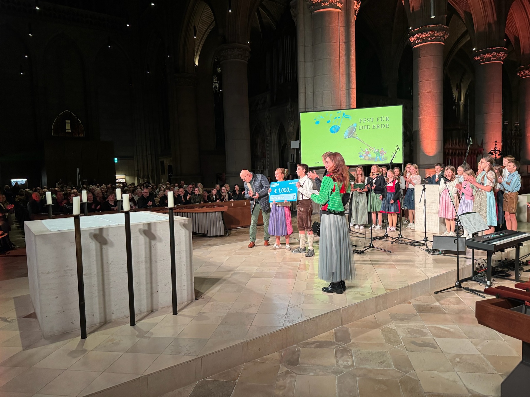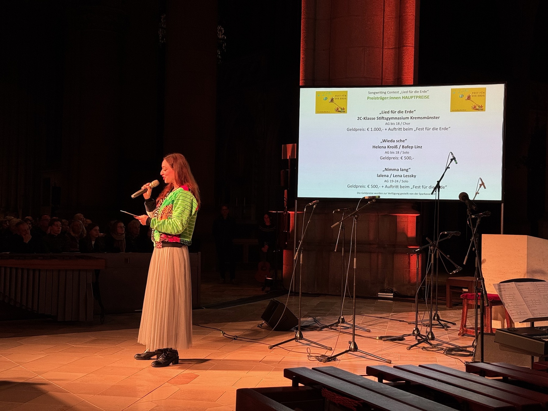 Der 1. Preis von zahlreichen Einreichungen ging an das „Lied für die Erde“ von Prof. Andrea Schedlberger und wurde mit 1000 Euro prämiert. Eine fachkundige Jury, bestehend aus bekannten Musikerinnen und Musikern sowie Musikpädagoginnen und Musikpädagogen des Landes, wählte diesen Song zuvor zum Gewinner des Bewerbs. Im Rahmen des abendlichen Konzerts mit verschiedenen Beiträgen wurde er zum ersten Mal im Dom aufgeführt; anschließend wurde der Preis von Umwelt-Landesrat Mag. Stefan Kaineder im Beisein von Bischof Dr. Manfred Scheuer überreicht. Das Lied live im Mariendom vor großem Publikum vorzutragen, war sicherlich die schönste Auszeichnung für die Kinder, die dadurch den Nachmittag mit Soundcheck, dem gemeinsamen Pizza-Essen und dem Hinfiebern auf den späten Auftritt um 22:00 Uhr gerne in Kauf genommen haben.