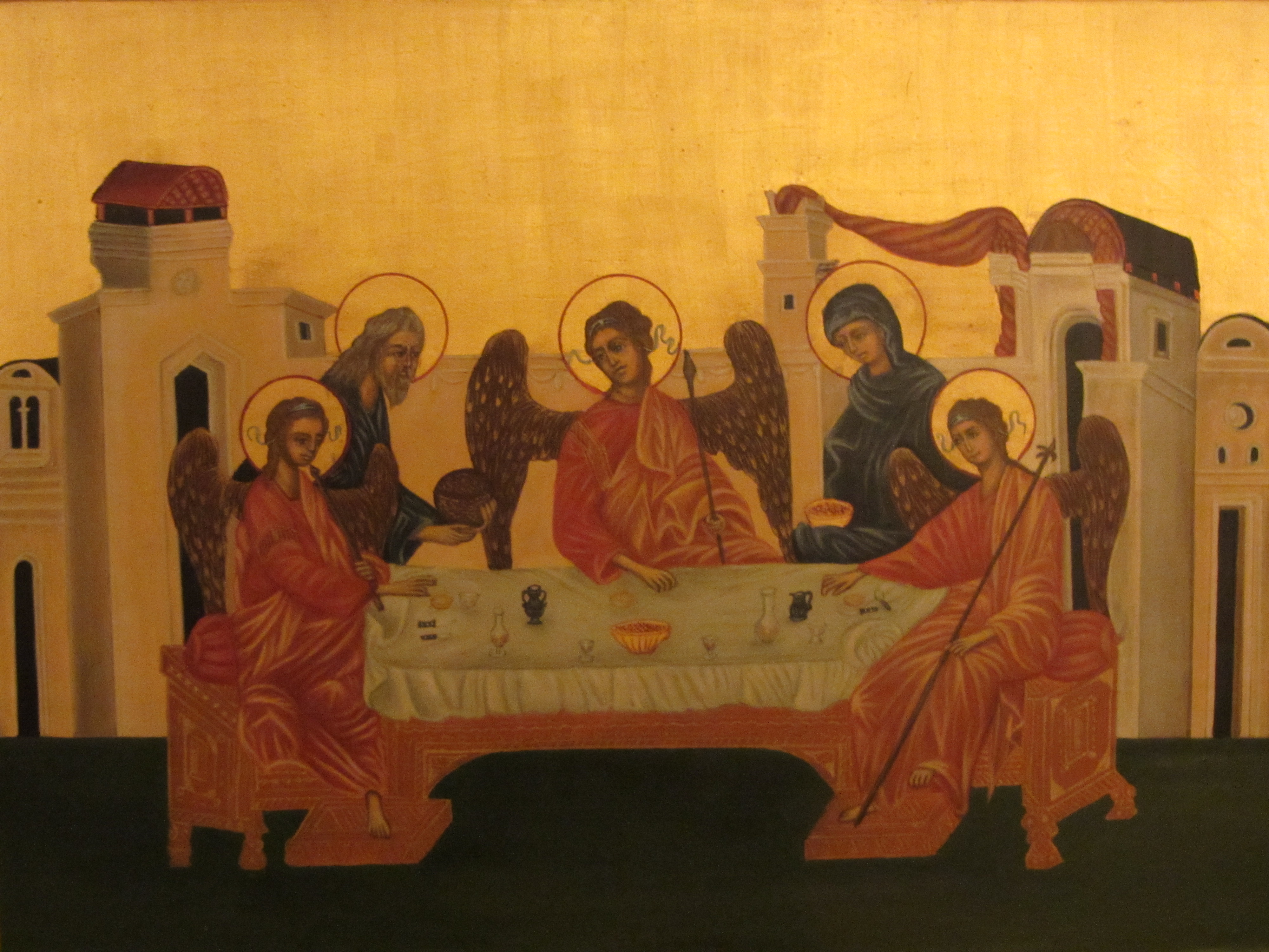 Sie ist ein Abbild einer byzantinischen Ikone aus dem 14. Jh., die die Gastfreundschaft Abrahams und Saras zum Thema hat.