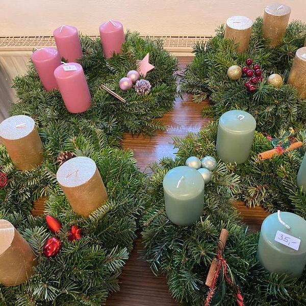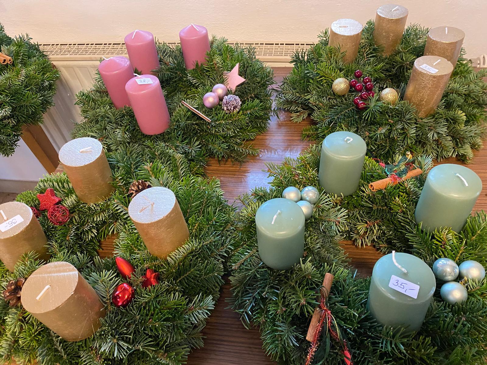 Die Adventkränze stehen zur Abholung im Pfarrsaal bereit...