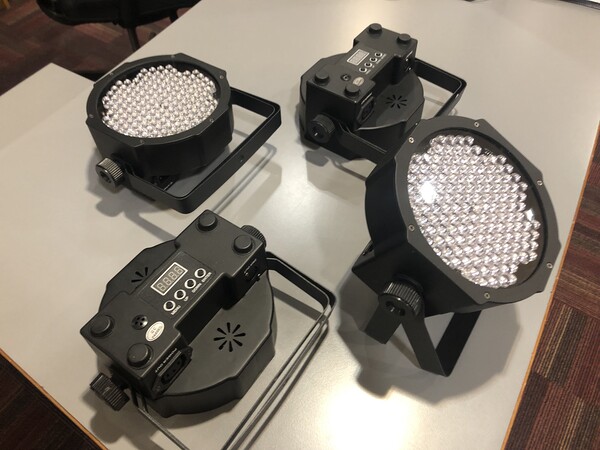 Ein großer Strom- und LED-strahler, ein Effektstrahler, mit dem sich dekorative Lichteffekte erzeugen lassen. Er ist für professionelle Anwendungen auf Bühnen, Theater und Kirchen vorgesehen. Lichteffekte können mittels XLR-Kabel analog zur Musik gesteuert werden, und sie können in Serie geschaltet werden. Nur im Inneren verwenden (nicht wasserdicht)! Insgesamt sind 4 Stück vorhanden, zu viert in einem Alu-Koffer verpackt.