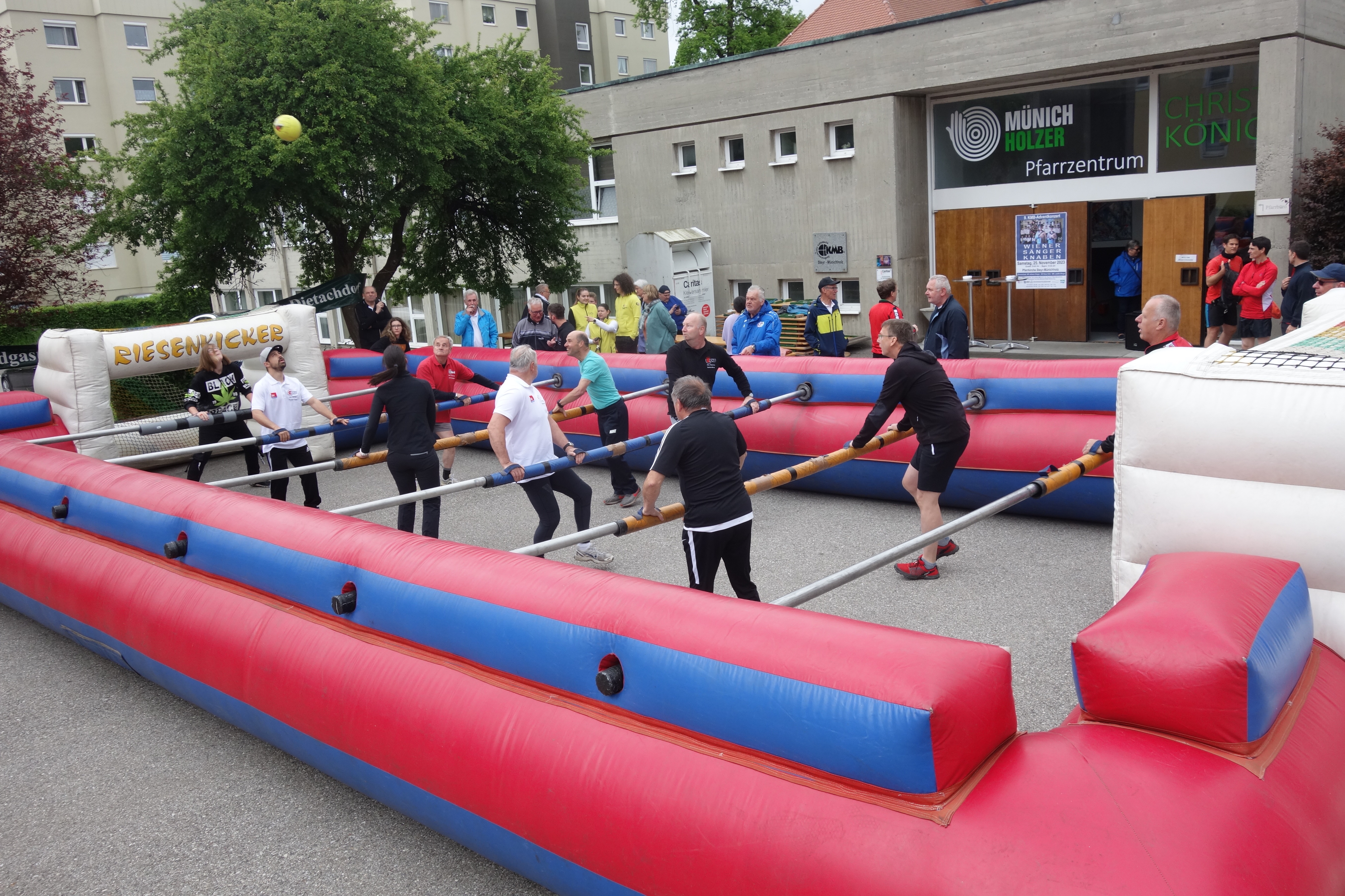 Obwohl in der Früh der Himmel noch mit dichten dunklen Wolken verhangen war, hat sich der Veranstalter entschlossen den Riesenwuzzler im Freien am Kirchenplatz aufzustellen. Diese Entscheidung hat sich als richtig erwiesen, denn im Lauf des Vormittags kam die Sonne und es wurde ein schöner Tag für das Turnier.