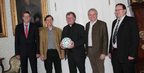 Katholische Männerbewegung macht den Vatertag zum Gewinn. Bischof Manfred Scheuer wurde beim Antrittsbesuch der Katholischen Männerbewegung (KMb) am 10. Juni 2016 fußballgerecht ausgestattet. Gewinnspiel der KMB lockt Fußballbegeisterte zum Vatertag.