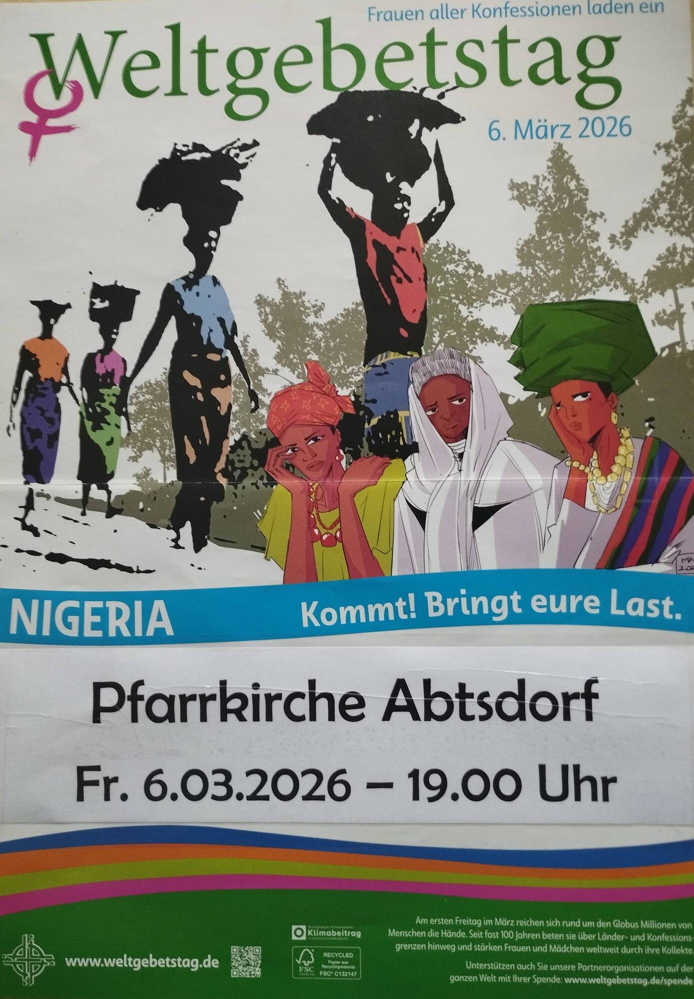 Herzliche Einladung zum Weltgebetstag der Frauen am Fr. 6.03. um 19.00 Uhr in der Kirche in Abtsdorf.