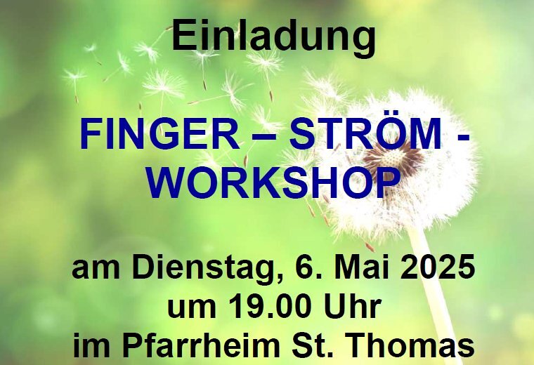 Die KFB lädt zu einem Workshop "FINGER-STRÖMEN" am Dienstag, den 6. Mai 2025 um 19:00 Uhr im Pfarrheim ein.