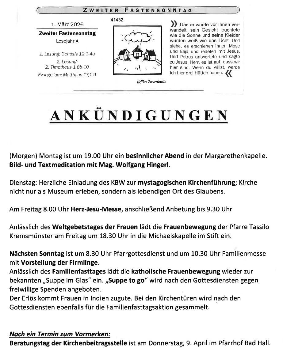Wir laden Sie herzlich zur Mitfeier der Gottesdienste in ein unserer 16 Pfarrgemeinden am 08.03.2026 März ein.