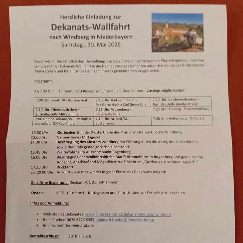 Auch im heurigen Jahr 2026 findet eine Dekanatswallfahrt statt, zu der wir herzlich einladen.