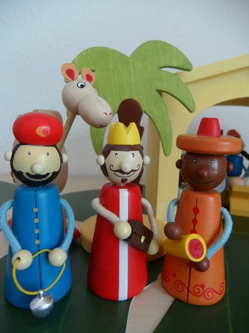 Die Krippenfiguren Maria, Josef und Esel machen sich auf den Weg zur Krippe.