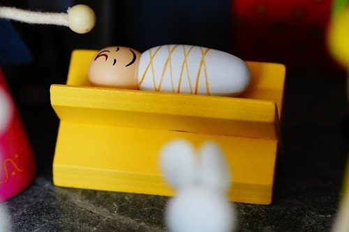 Er liegt als Kind in einer Krippe, in Windeln gewickelt.//